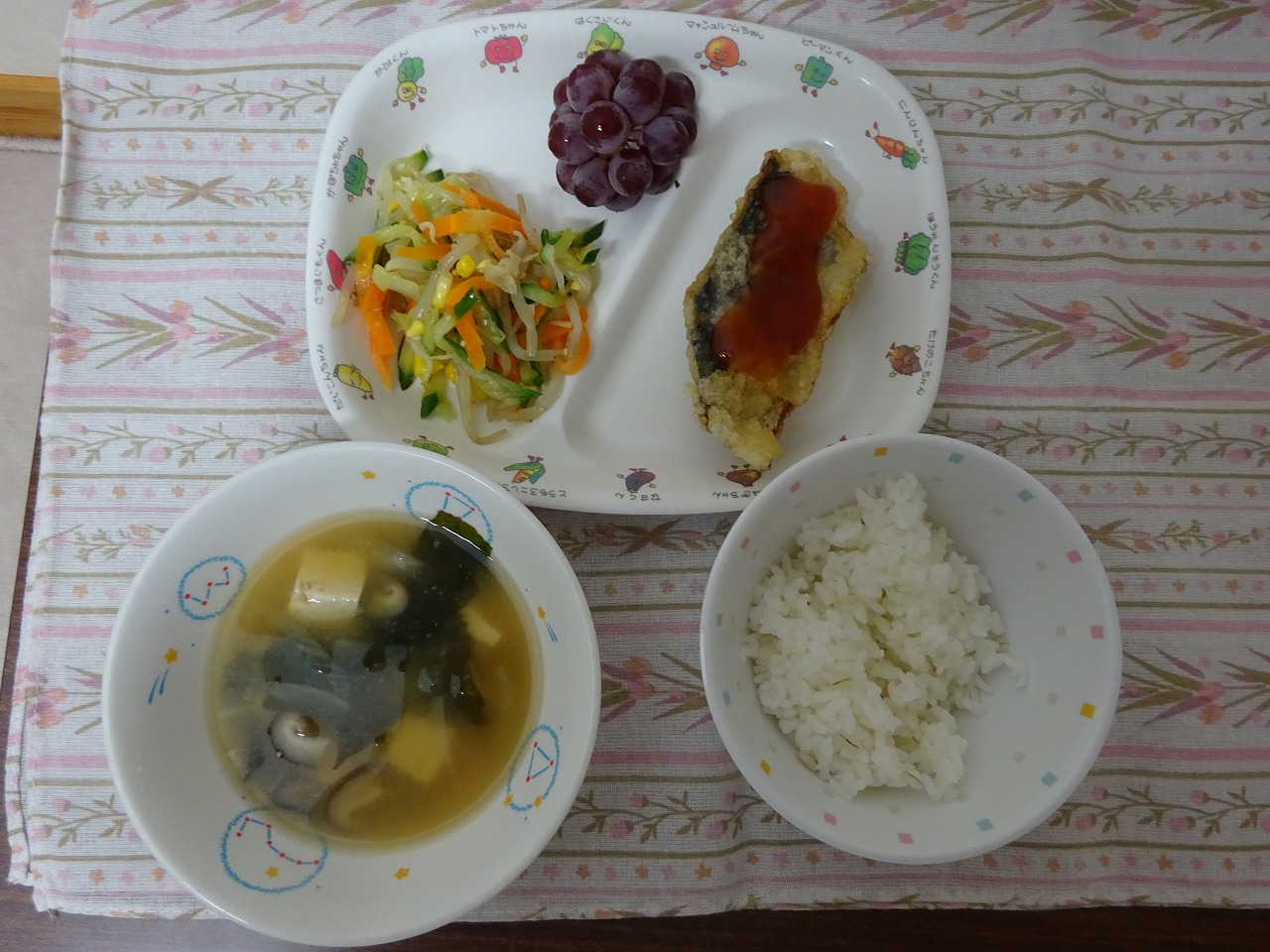 8月2日(水)給食 ・ごはん ・さわらの甘酢あん ・もやしのナムル ・みそ汁 ・ぶどう
