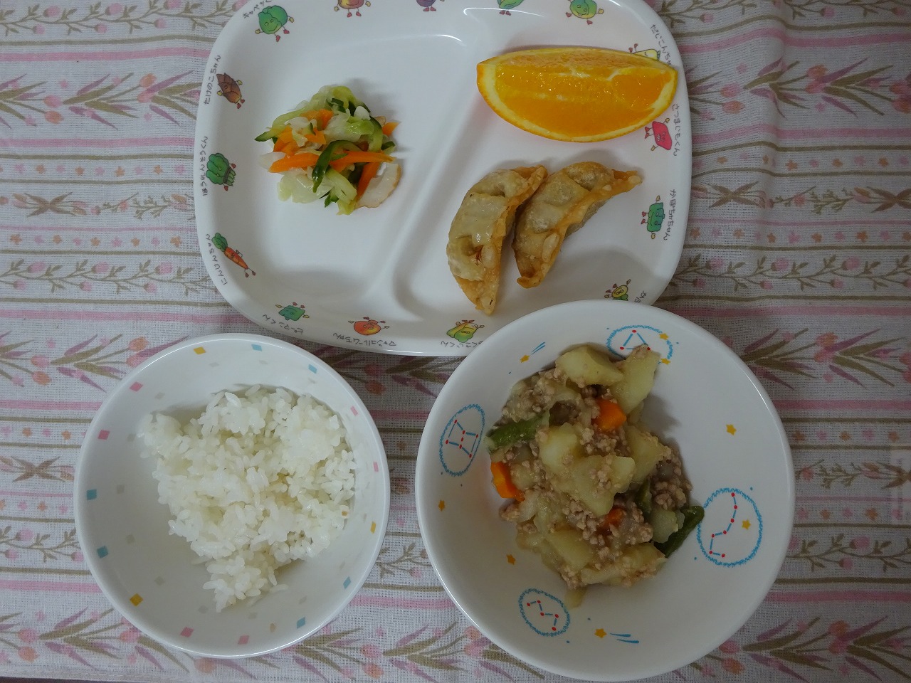 8月3日(木)給食 ・ごはん ・揚げギョウザ ・胡瓜の酢の物 ・じゃが芋のそぼろ煮 ・オレンジ