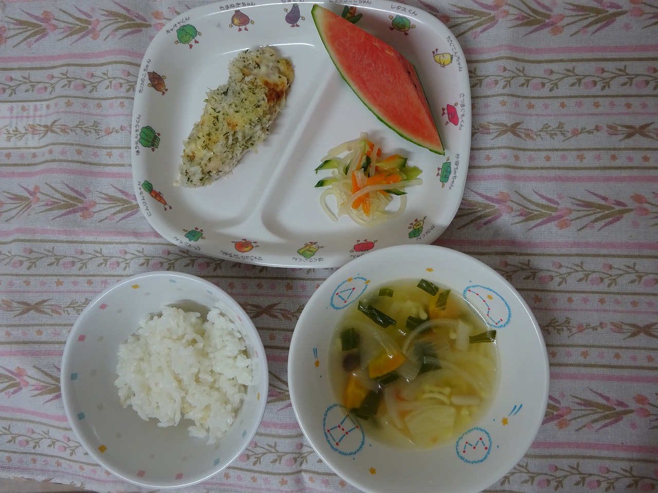 8月4日(金)給食 ・ごはん ・ささみのパン粉焼き ・マロニー中華和え ・ABCスープ ・すいか