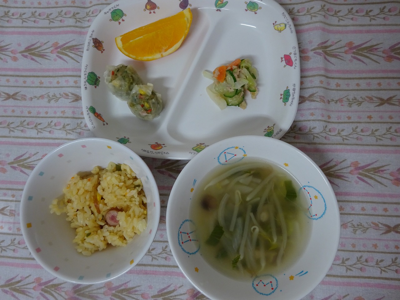 8月7日(月)給食 ・五目チャーハン ・野菜入り肉シューマイ ・ツナサラダ ・中華スープ ・オレンジ