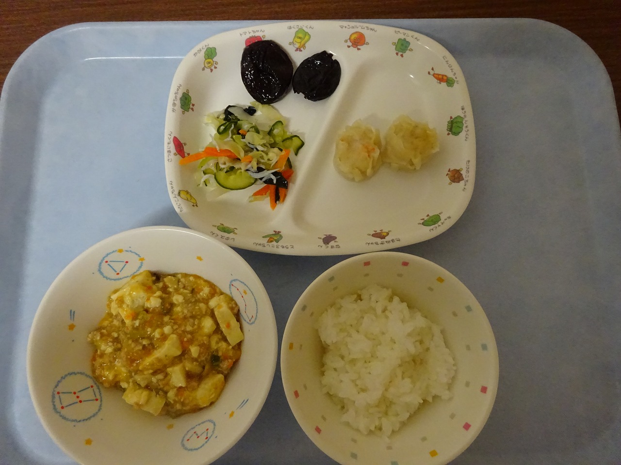 6月12日(月)給食 ・ごはん ・えびシューマイ ・キャベツの甘酢和え ・マーボー豆腐 ・プルーン