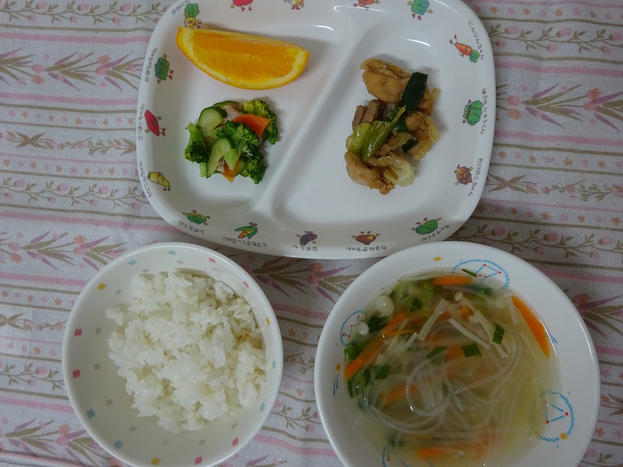 6月13日(火)給食 ・ごはん ・けいちゃん風炒め ・ブロッコリーサラダ ・春雨スープ ・オレンジ