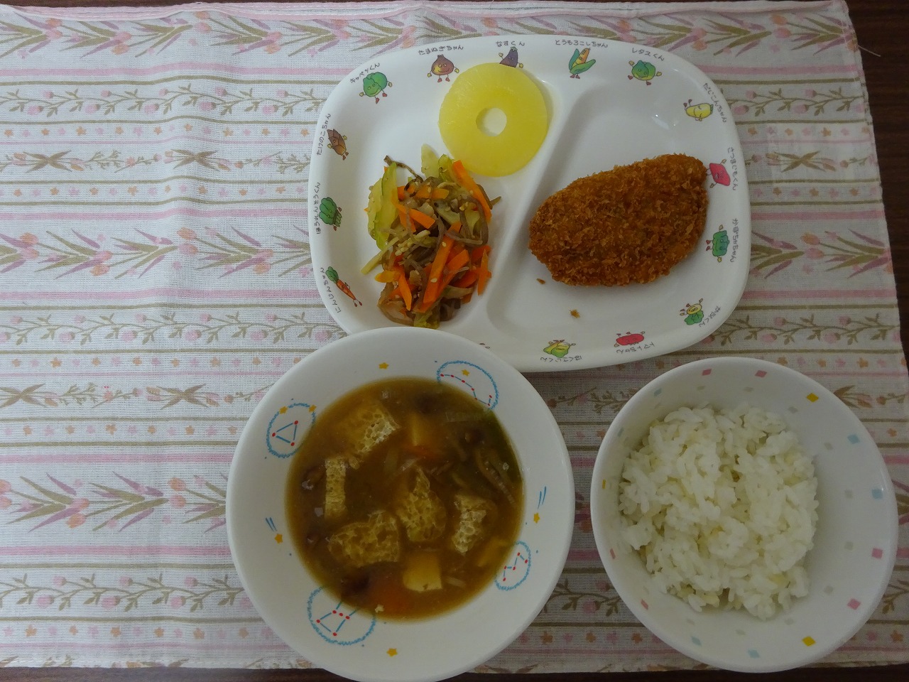 6月15日(木)給食 ・ごはん ・かつおフライ ・にんじんとセロリのきんぴら ・みそ汁 ・ベビーパイン