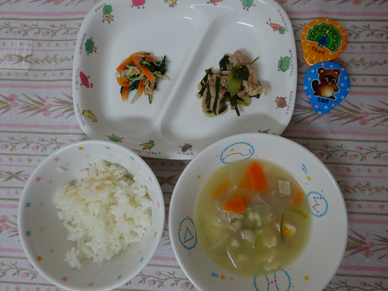 6月16日(金)給食 ・ごはん ・豚肉のみそ炒め ・かわりおひたし ・かみなり汁 ・ポックンゼリー