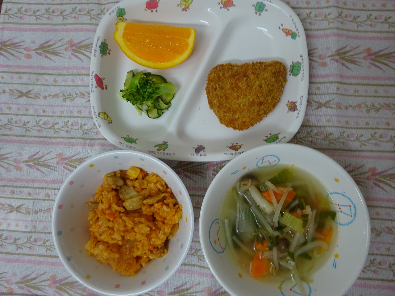 6月19日(月)給食 ・ケチャップライス ・南瓜の挽肉フライ ・グリーンサラダ ・コンソメスープ ・オレンジ