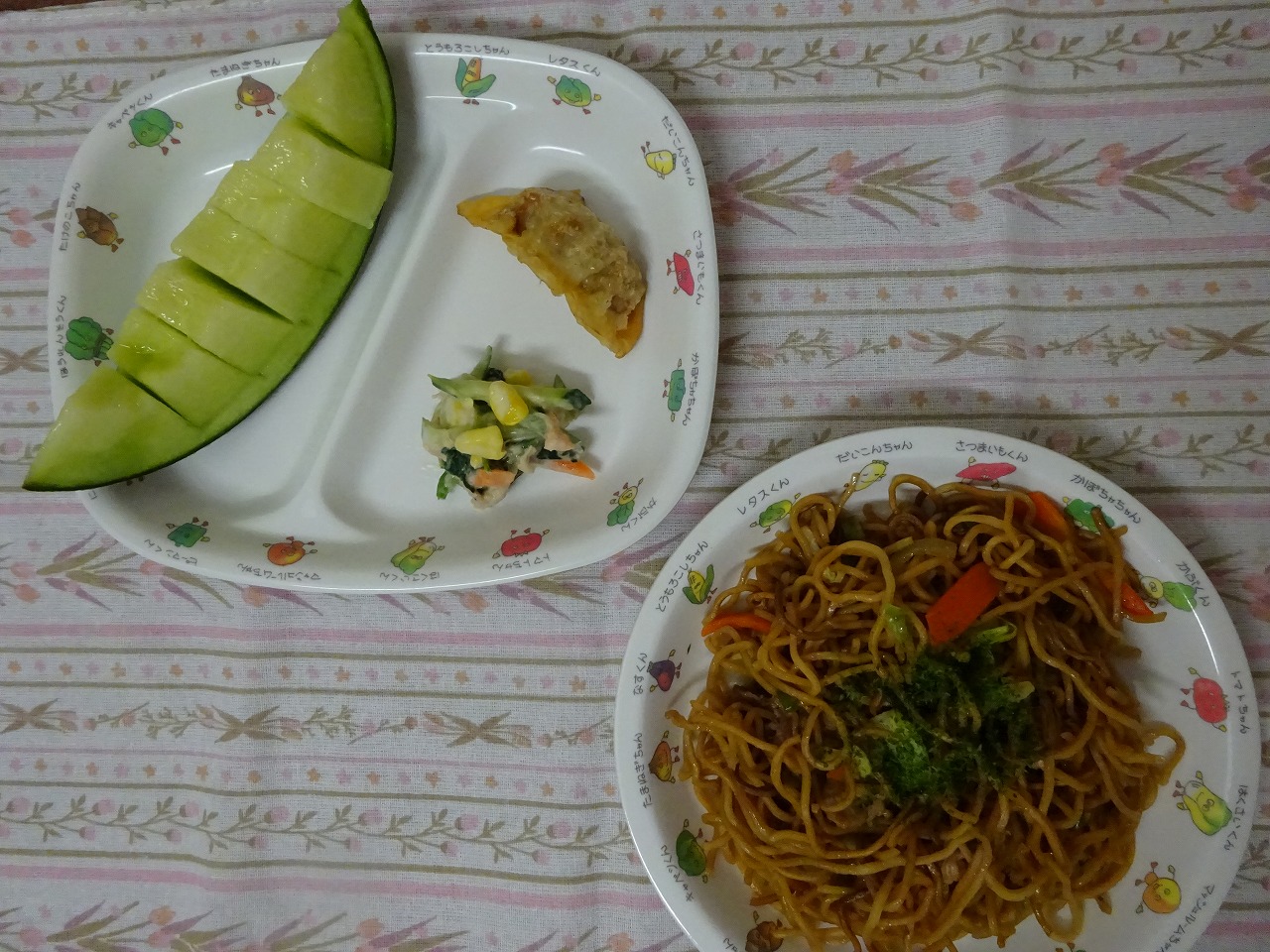 6月21日(水)給食 ・焼きそば ・揚げギョウザ ・ほうれん草サラダ ・メロン