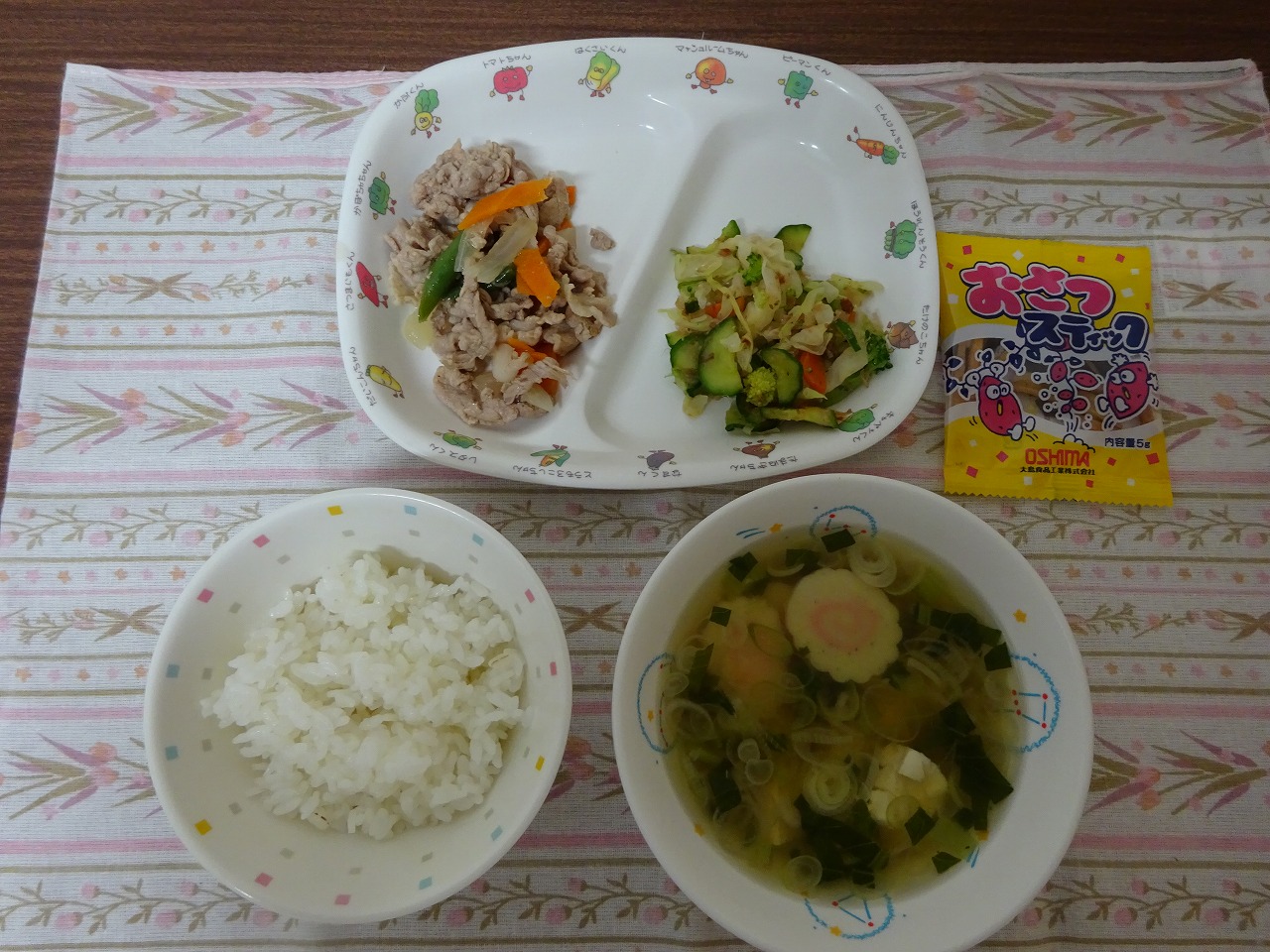 6月22日(木)給食 ・ごはん ・豚肉と玉葱のソテー ・ブロッコリーのおかか和え ・すまし汁 ・おさつスティック