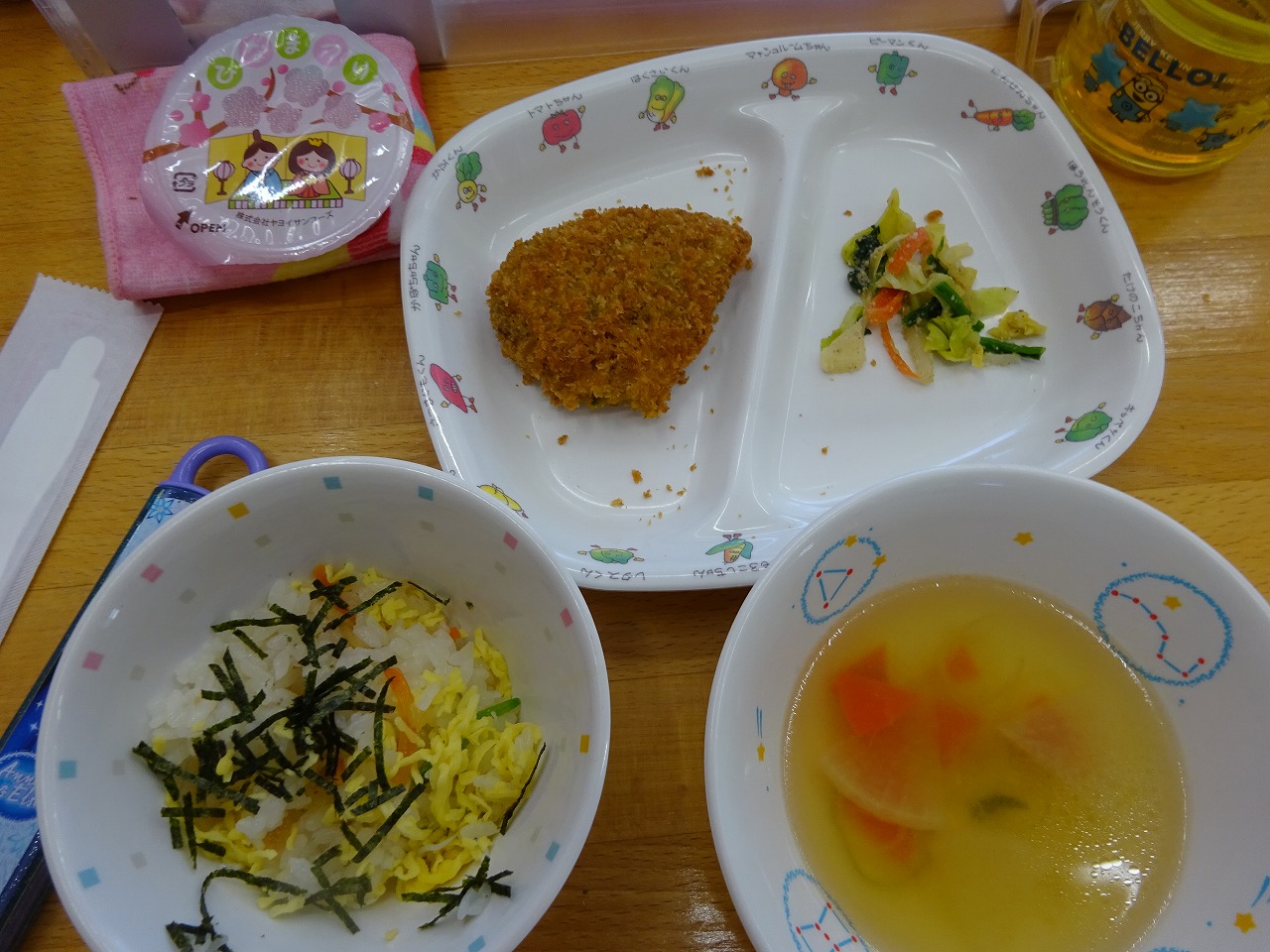 3月3日(金)給食 ・ちらし寿司(米・にんじん・れんこん・しらす干し・錦糸卵・さやえんどう・焼きのり) ・南瓜挽肉フライ ・ほうれん草ごまあえ(ほうれん草・キャベツ・もやし・にんじん・ごま) ・五目汁(鶏肉・油揚げ・だいこん・にんじん・こんにゃく・ねぎ) ・ひなまつりゼリー