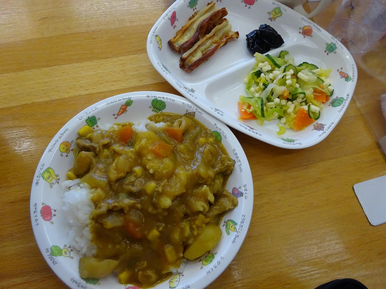3月6日(月)給食 ・カレーライス(米・豚肉・じゃがいも・にんじん・玉ねぎ・ピーマン・コーン) ・チーズサラダ(チーズ・キャベツ・きゅうり・にんじん) ・ちくわのマヨ焼き ・プルーン
