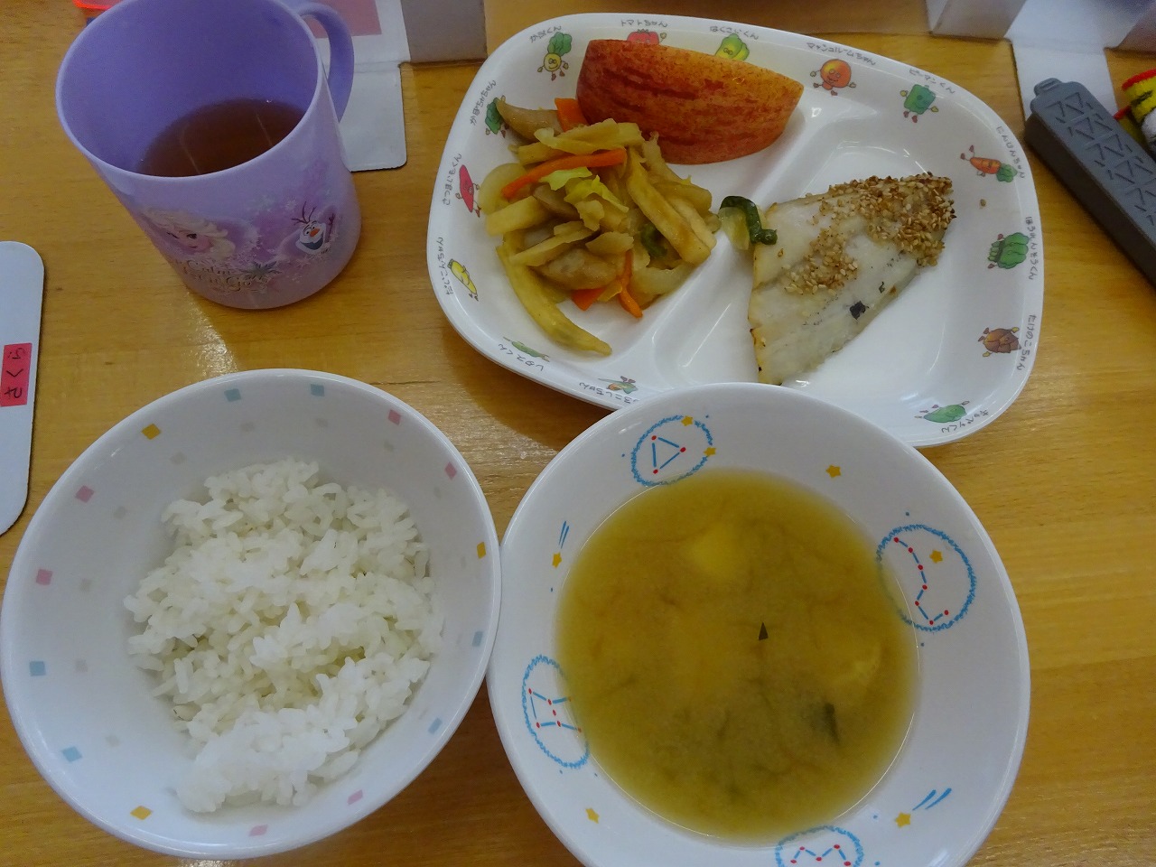 3月7日(火)給食 ・ごはん ・さわらのごま焼き ・いろどりソテー(ウインナー・キャベツ・玉ねぎ・にんじん・ピーマン・ポテト) ・みそ汁(豆腐・油揚げ・チンゲン菜・にんじん・わかめ・みそ) ・りんご