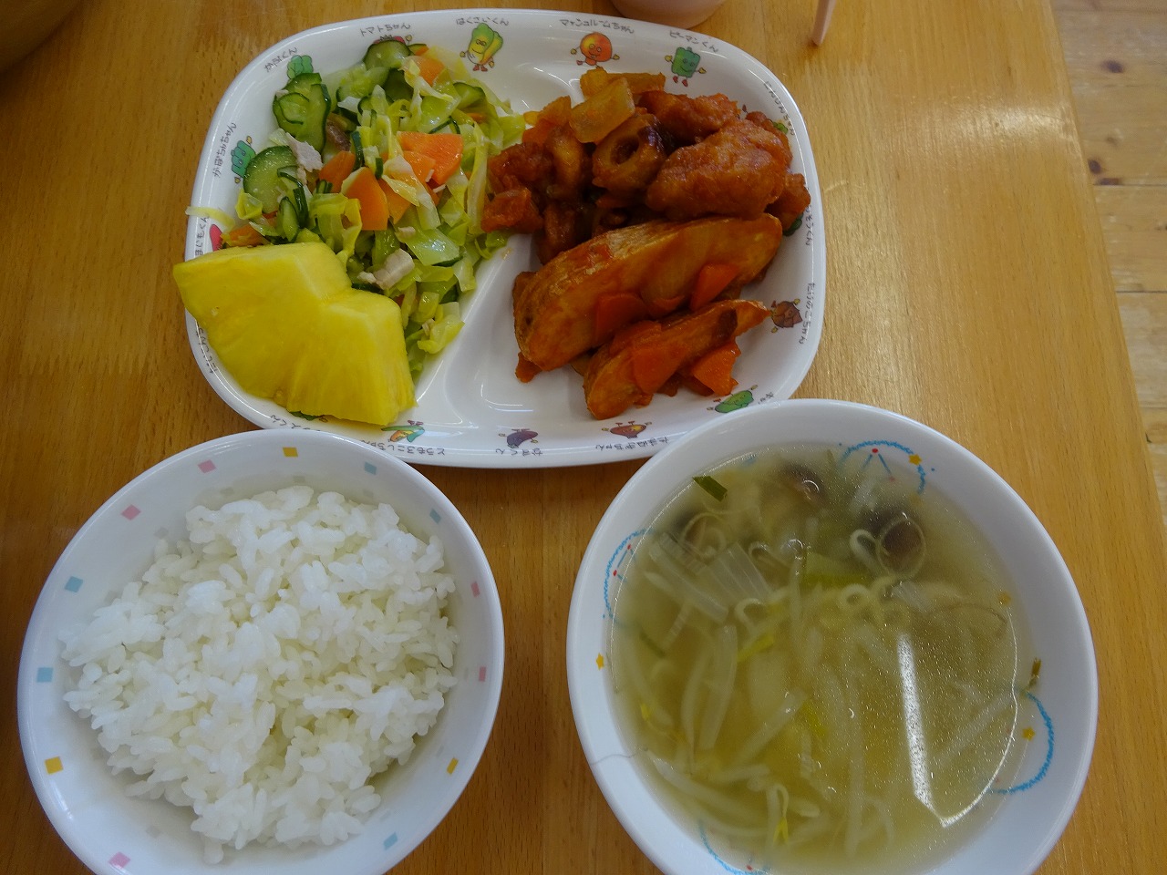 3月8日(水)給食 ・ごはん ・かしわのノルウェー煮(鶏肉・ポテト・ちくわ・にんじん・玉ねぎ・グリンピース) ・キャベツサラダ(キャベツ・きゅうり・にんじん・ハム) ・ABCスープ(マカロニ・玉ねぎ・もやし・しめじ・ねぎ) ・パイナップル