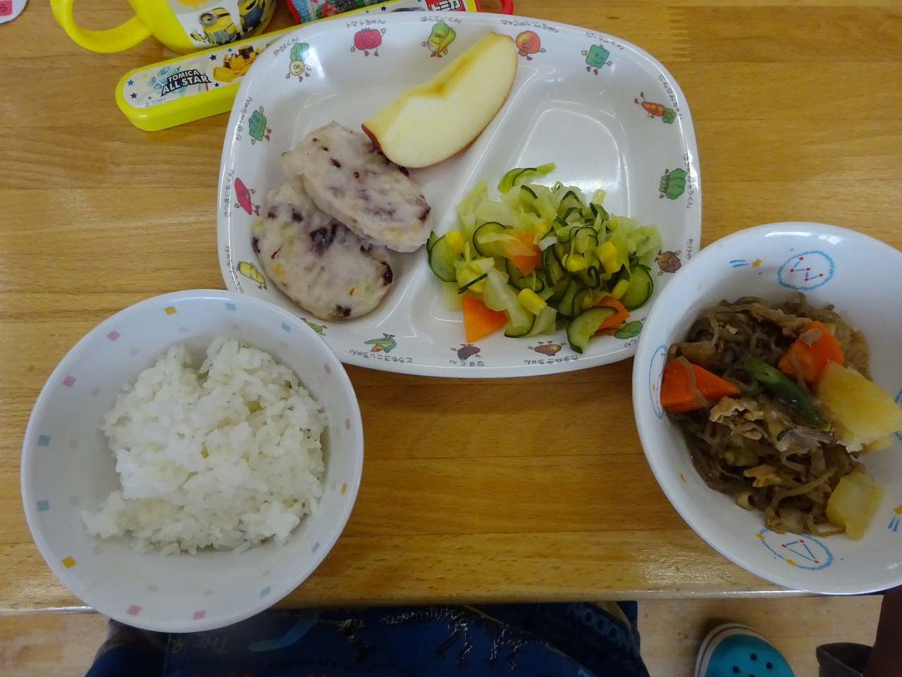 3月16日(木)給食 ・ごはん ・肉じゃが(豚肉・じゃがいも・玉ねぎ・にんじん・こんにゃく・いんげん) ・コーンサラダ(コーン・キャベツ・きゅうり・にんじん) ・イカたっぷり小判 ・りんご