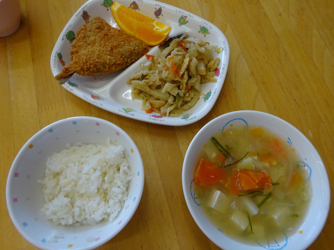 3月20日(月)給食 ・ごはん ・あじフライ ・切干大根の煮物(切干大根・油揚げ・にんじん・ちくわ・いんげん) ・みそ汁(豆腐・じゃがいも・玉ねぎ・にんじん・みそ) ・オレンジ