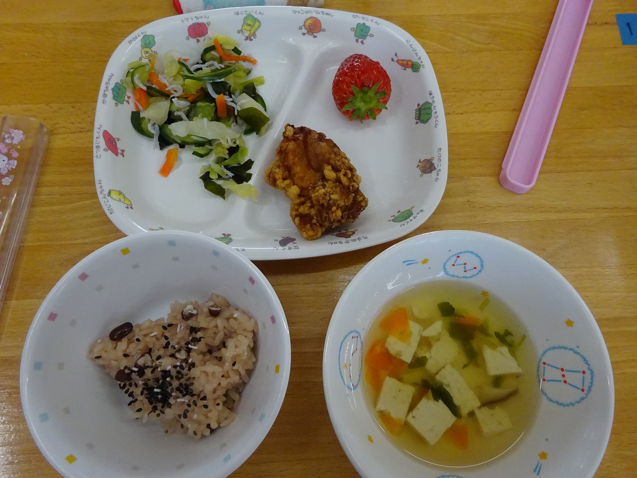 3月22日(水)給食 と おやつ ・赤飯(もち米・小豆) ・鶏肉の唐揚げ ・キャベツの甘酢あえ(キャベツ・きゅうり・にんじん・しらす干し・わかめ) ・れんこんチップス ・マスカットゼリー 今日のおやつは、『マーブルケーキ』