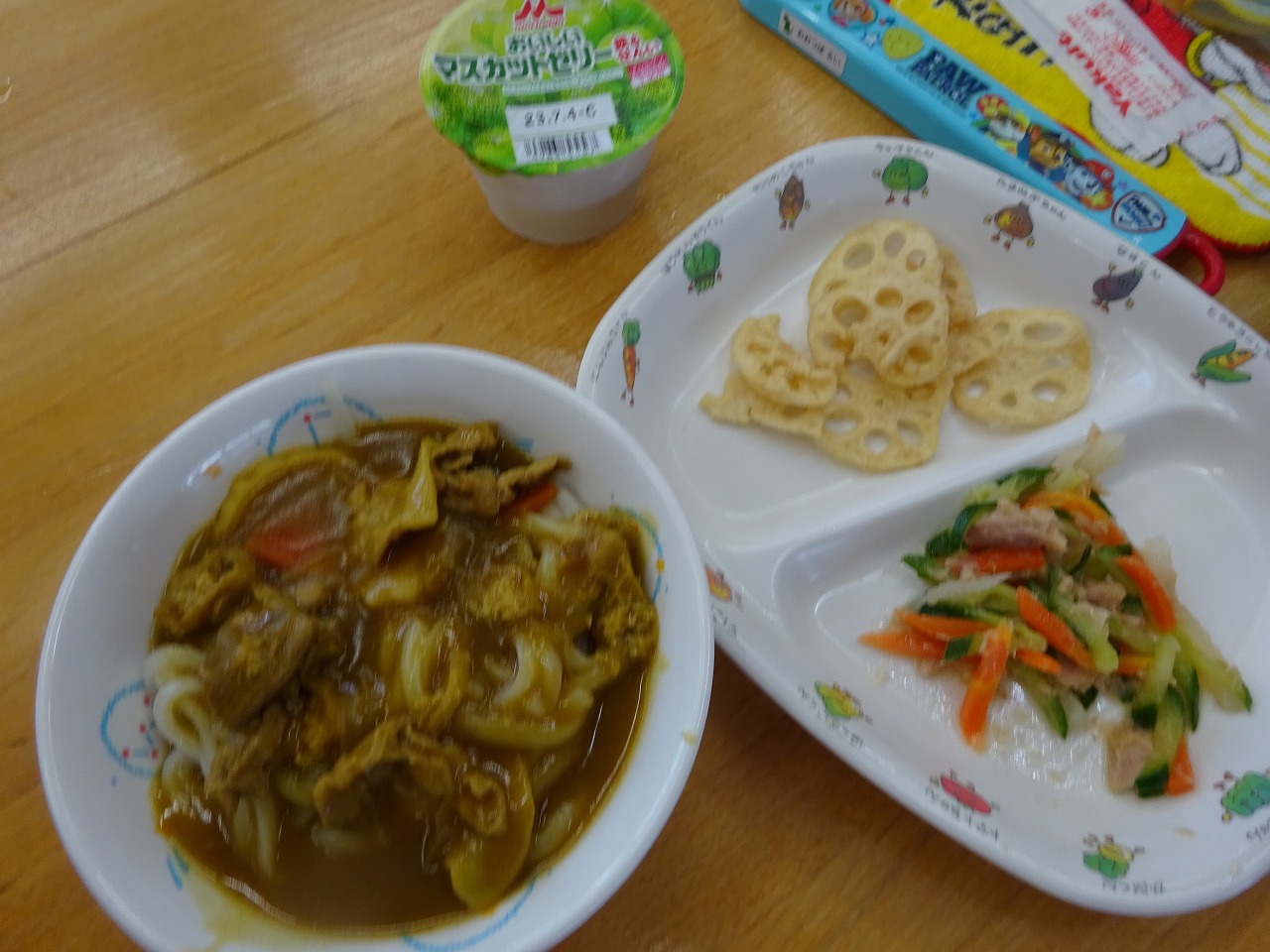 3月23日(木)給食 ・カレーうどん(うどん・豚肉・なると・玉ねぎ・にんじん・ねぎ) ・だいこんサラダ(だいこん・ツナ・きゅうり・にんじん) ・れんこんチップス ・ゼリー