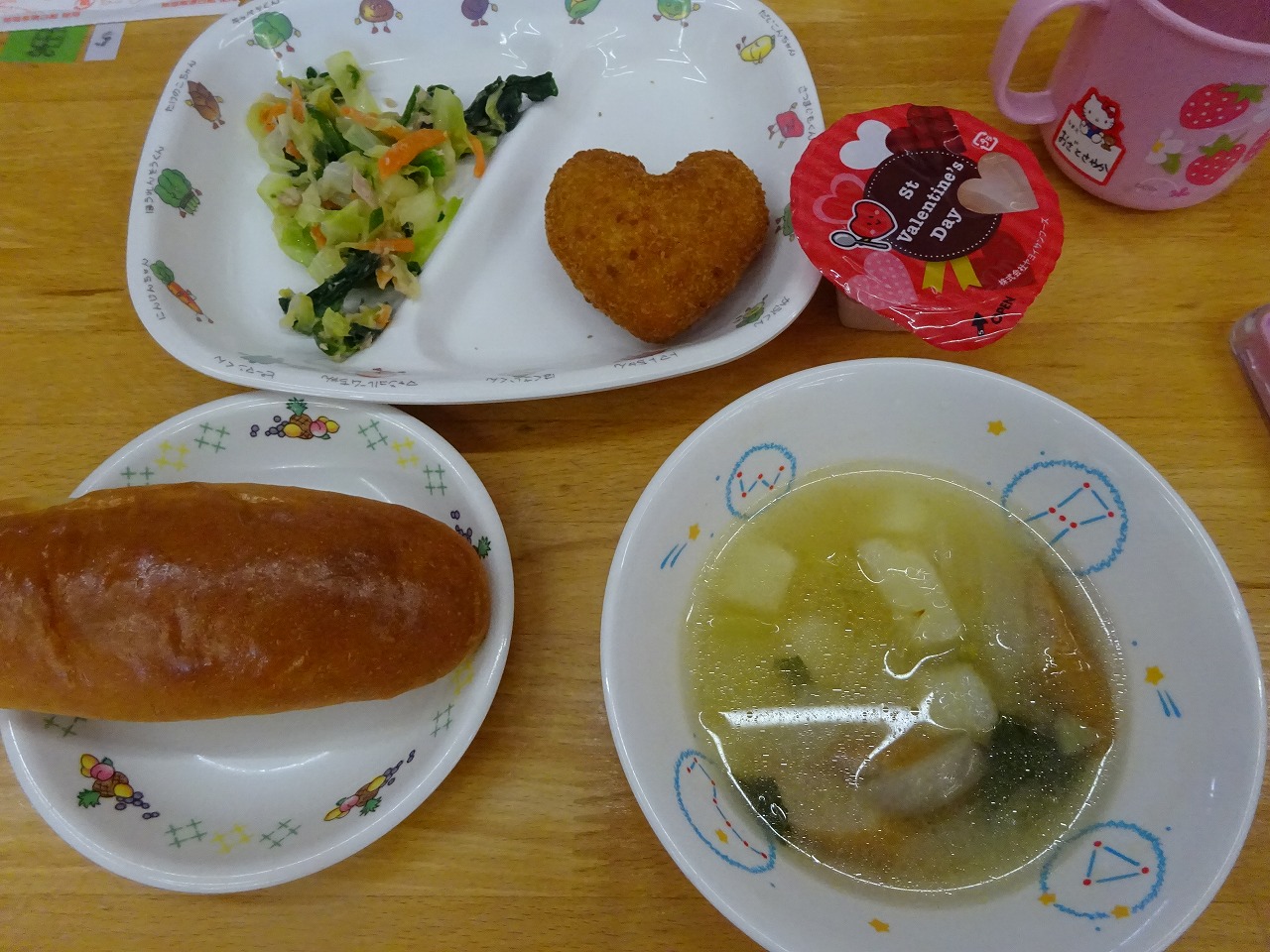 2月14日(火)給食 ・パン ・ハートのコロッケ ・ほうれん草サラダ(ほうれん草・ツナ・キャベツ・きゅうり・にんじん) ・ポトフ(ウインナー・じゃがいも・玉ねぎ・チンゲン菜・にんじん) ・イチゴのハートカップ