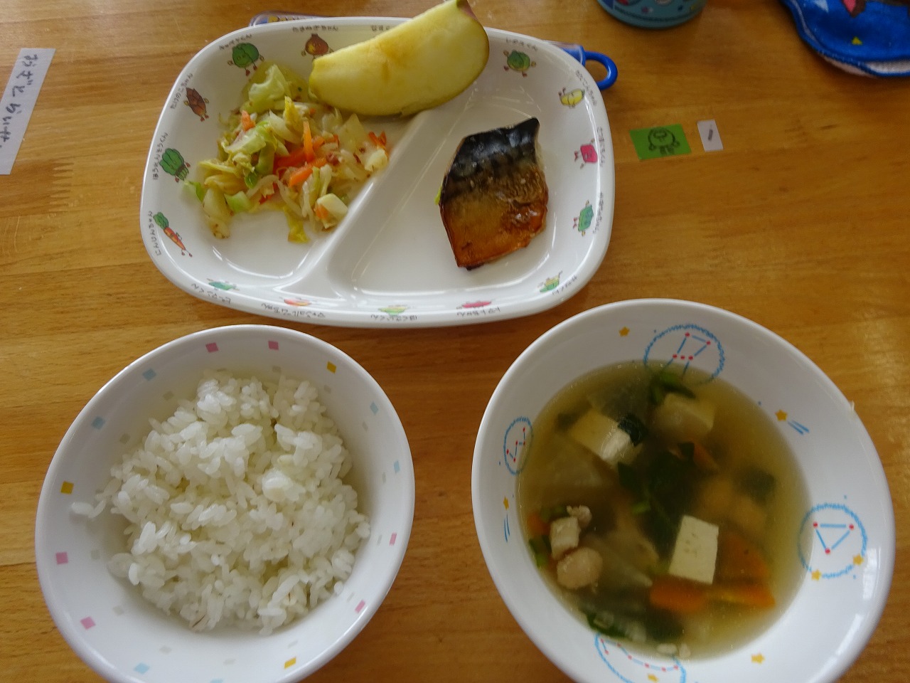 2月15日(水)給食 ・ごはん ・さばのごまだれかけ ・白菜のおかかあえ(白菜・キャベツ・にんじん・もやし) ・五目汁(鶏肉・豆腐・大根・にんじん・こまつな・ねぎ) ・りんご