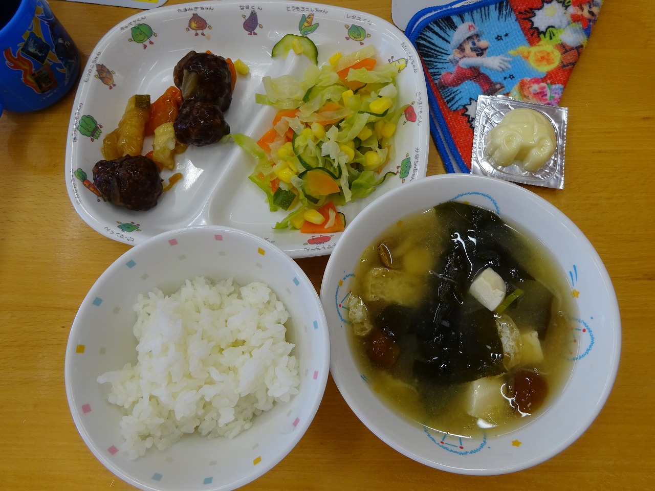 2月16日(木)給食 ・ごはん ・肉団子の甘辛煮(合挽肉・玉ねぎ・卵・パン粉・ポテト・にんじん・ピーマン) ・フレンチサラダ(キャベツ・きゅうり・にんじん・コーン) ・みそ汁(豆腐・油揚げ・なめこ・ねぎ・わかめ・みそ) ・チーズ