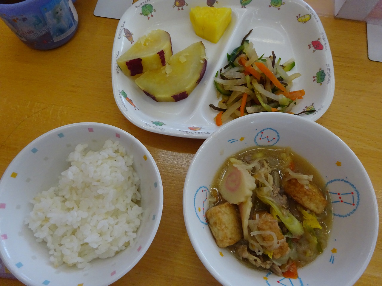 2月17日(金)給食 ・ごはん ・すき焼き風煮(豚肉・厚揚げ・なると・しらたき・玉ねぎ・白菜・にんじん・えのきたけ) ・大根の塩昆布あえ(大根・きゅうり・にんじん・塩昆布) ・さつま芋の甘煮 ・パイナップル