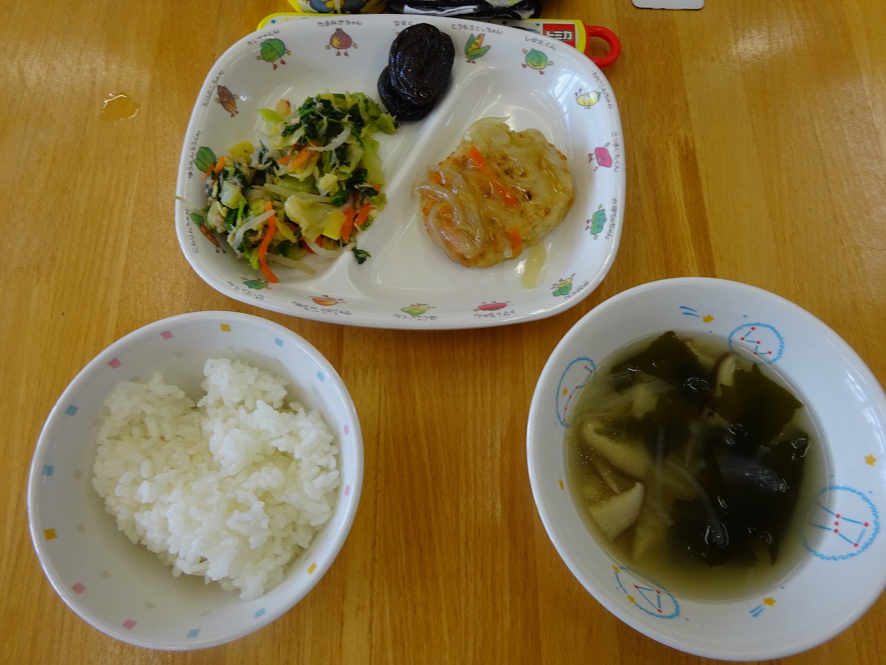2月20日(月)給食 ・ごはん ・豆腐ハンバーグ野菜あんかけ(豆腐ハンバーグ・玉ねぎ・にんじん) ・かわりおひたし(ほうれん草・ツナ・キャベツ・にんじん・もやし) ・春雨スープ(マロニー・玉ねぎ・しいたけ・わかめ) ・プルーン