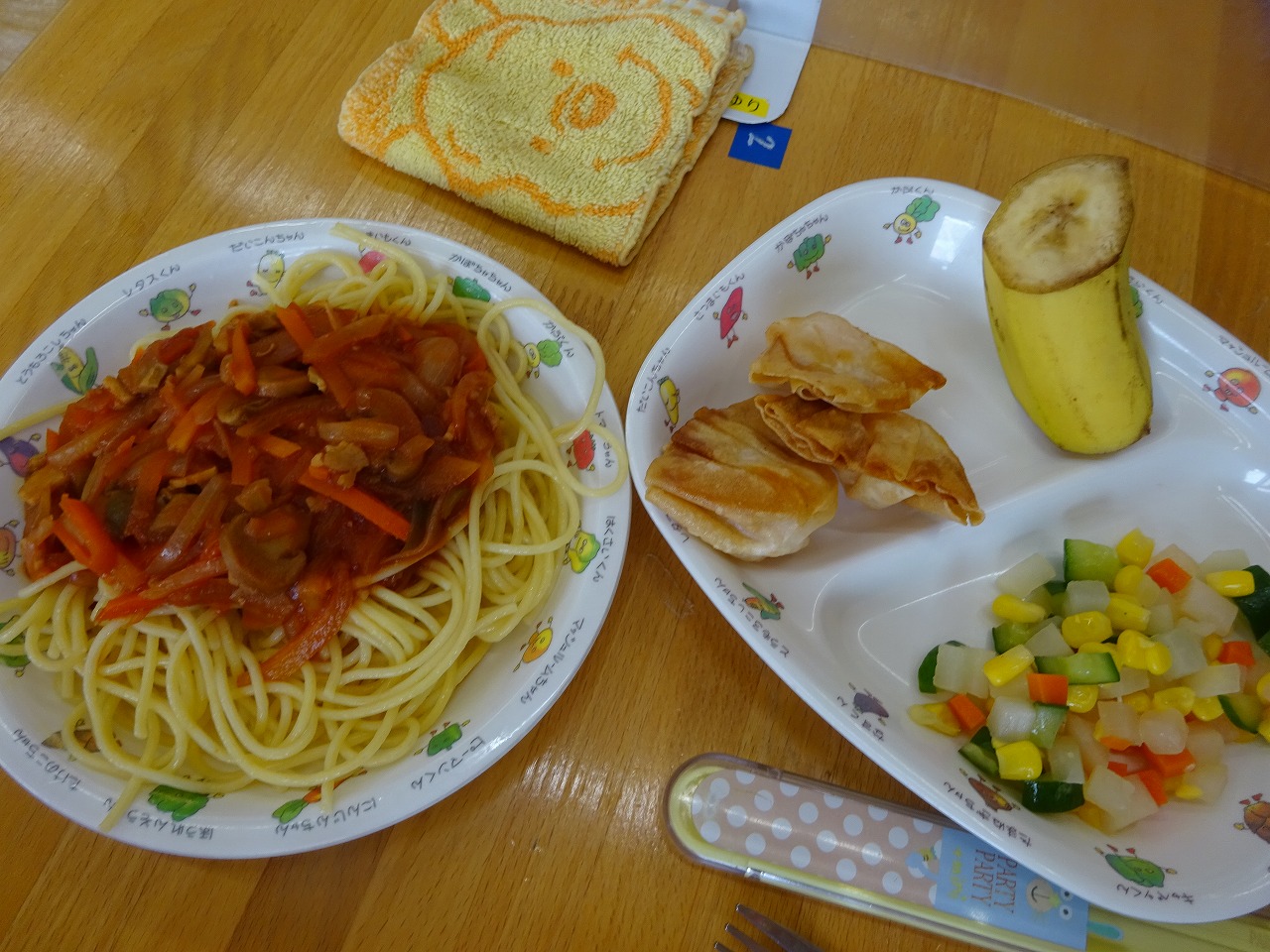 2月21日(火)給食 ・ナポリタンスパゲッティ(パスタ・ベーコン・玉ねぎ・にんじん・ピーマン・ケチャップ) ・コロコロサラダ(大根・きゅうり・にんじん・コーン) ・えび揚げギョウザ ・バナナ