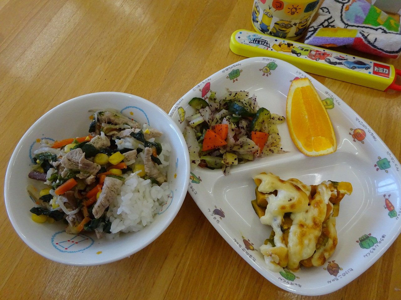 2月27日(月)給食 ・ビビンバ(米・豚肉・もやし・にんじん・ほうれん草・ゼンマイ・コーン) ・ゆかりあえ(キャベツ・きゅうり・にんじん・ゆかり) ・かぼちゃのマヨ焼き ・オレンジ