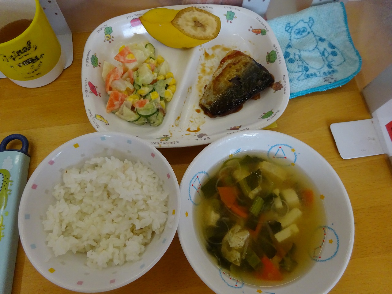 3月1日(水)給食 ・ごはん ・さばの生姜煮 ・ポテトサラダ(じゃがいも・ハム・きゅうり・にんじん・コーン) ・みそ汁(豆腐・油揚げ・にんじん・こまつな・ねぎ・みそ) ・バナナ