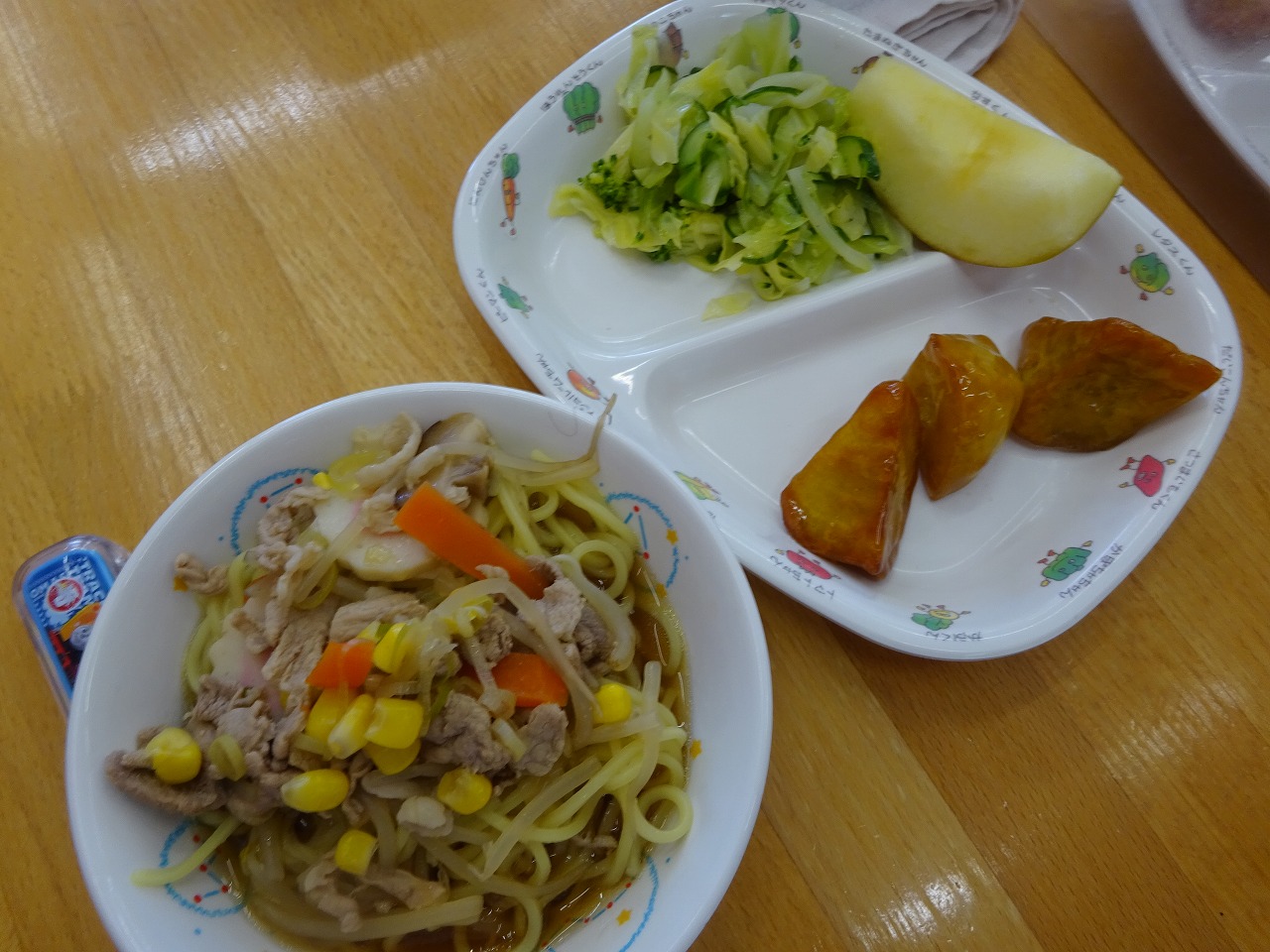 3月2日(木)給食 ・しょうゆラーメン(めん・豚肉・なると・もやし・にんじん・ねぎ・コーン) ・中華ポテト(さつまいも) ・グリーンサラダ(ブロッコリー・キャベツ・きゅうり) ・りんご