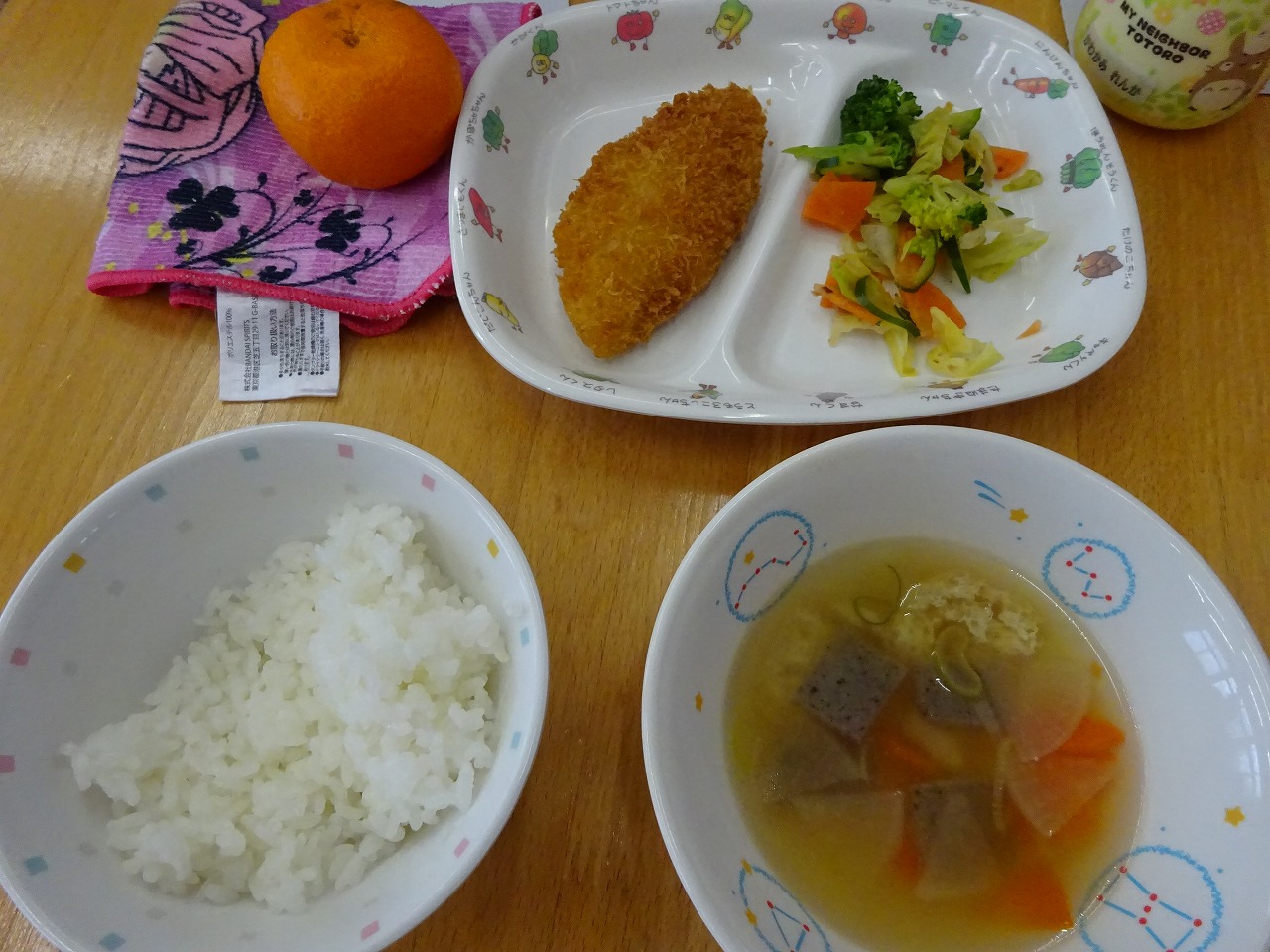 1月30日(月)給食 ・ごはん ・白身魚フライ ・ブロッコリーおかかあえ(ブロッコリー・キャベツ・きゅうり・にんじん・かつお節) ・たぬき汁(鶏肉・油揚げ・大根・にんじん・こんにゃく・ねぎ) ・みかん