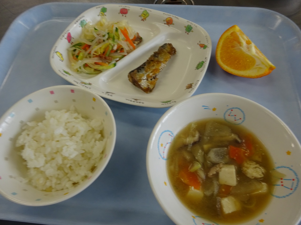2月3日(金)給食 ・ごはん ・いわしのみぞれ煮 ・マロニーの中華あえ(マロニー・ハム・キャベツ・きゅうり・にんじん) ・豚汁(豚肉・豆腐・油揚げ・だいこん・にんじん・ごぼう・こんにゃく・ねぎ) ・いよかん
