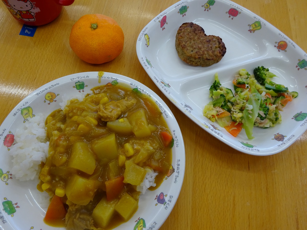 2月6日(月)給食 ・カレーライス(米・豚肉・じゃがいも・玉ねぎ・にんじん・ピーマン・コーン) ・ハート型ハンバーグ ・ツナサラダ(ツナ・キャベツ・ブロッコリー・きゅうり・にんじん) ・みかん