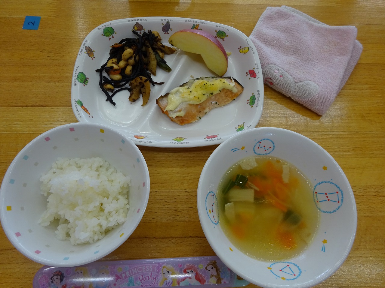 2月7日(火)給食 ・ごはん ・鮭のサクサク焼き(鮭・パン粉・粉チーズ・マヨドレ・パセリ) ・ひじきと大豆の煮もの(ひじき・大豆・にんじん・ちくわ・いんげん) ・コンソメスープ(ちんげん菜・ベーコン・玉ねぎ・にんじん・えのきたけ) ・りんご