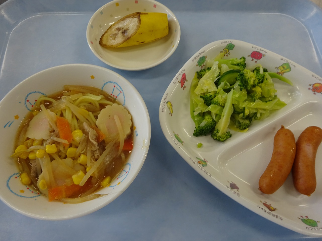 2月8日(水)給食とおやつ ・みそラーメン(麺・豚肉・なると・玉ねぎ・もやし・にんじん・ねぎ・コーン) ・グリーンサラダ(キャベツ・ブロッコリー・きゅうり) ・ウインナー ・バナナ 今日のおやつは、『揚げパン』