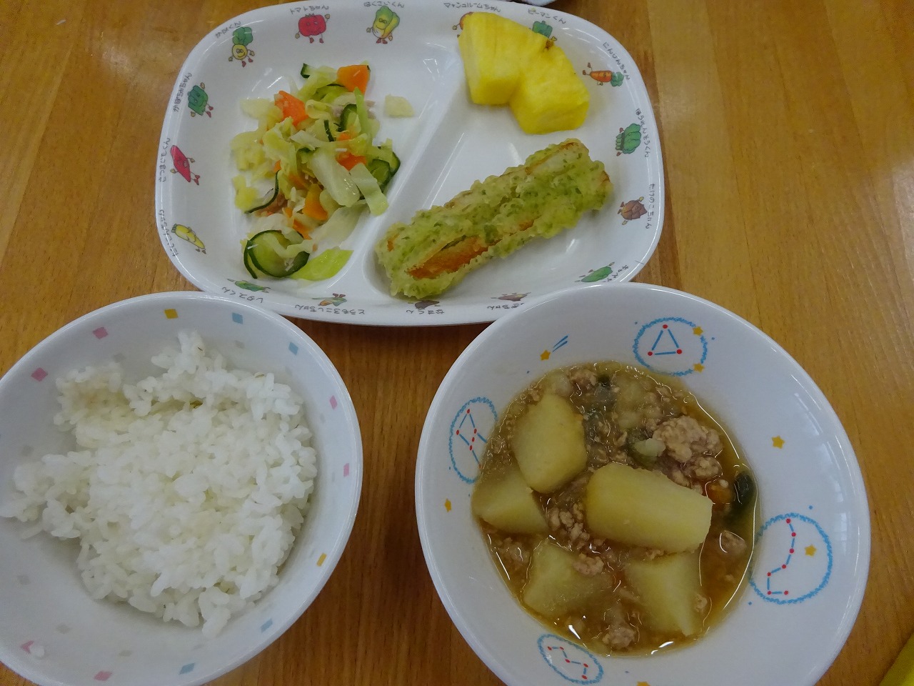 2月10日(金)給食 ・ごはん ・じゃが芋のそぼろ煮(じゃがいも・豚挽肉・玉ねぎ・にんじん・いんげん) ・キャベツサラダ(キャベツ・きゅうり・にんじん・ハム) ・ちくわの磯辺揚げ ・パイナップル