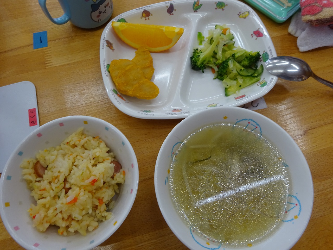 2月13日(月)給食 ・カラフルチャーハン(米・ウインナー・玉ねぎ・にんじん・パプリカ ・ブロッコリーサラダ(ブロッコリー・キャベツ・きゅうり・にんじん) ・チキンナゲット ・ABCスープ(マカロニ・玉ねぎ・もやし・しめじ・ねぎ) ・オレンジ