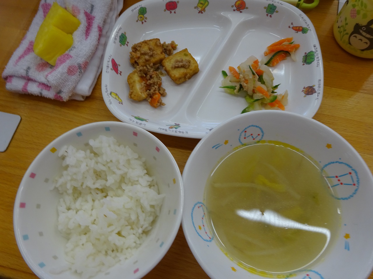 1月11日(水)給食 ・ごはん ・マーボー厚揚げ(厚揚げ・豚挽肉・にんじん・ねぎ・グリンピース) ・だいこんサラダ(だいこん・きゅうり・にんじん・ツナ) ・もやしスープ(もやし・はくさい・玉ねぎ・コーン) ・パイナップル