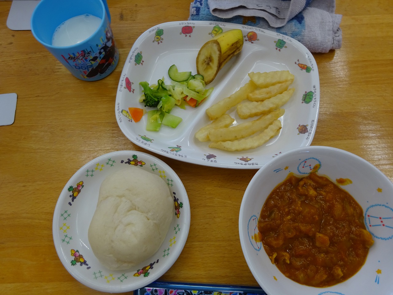 1月12日(木)給食 ・ロールパン ・バターチキンカレー(鶏肉・玉ねぎ・にんじん・トマト・バター) ・キャベツサラダ(キャベツ・きゅうり・にんじん・ブロッコリー) ・フライドポテト ・バナナ