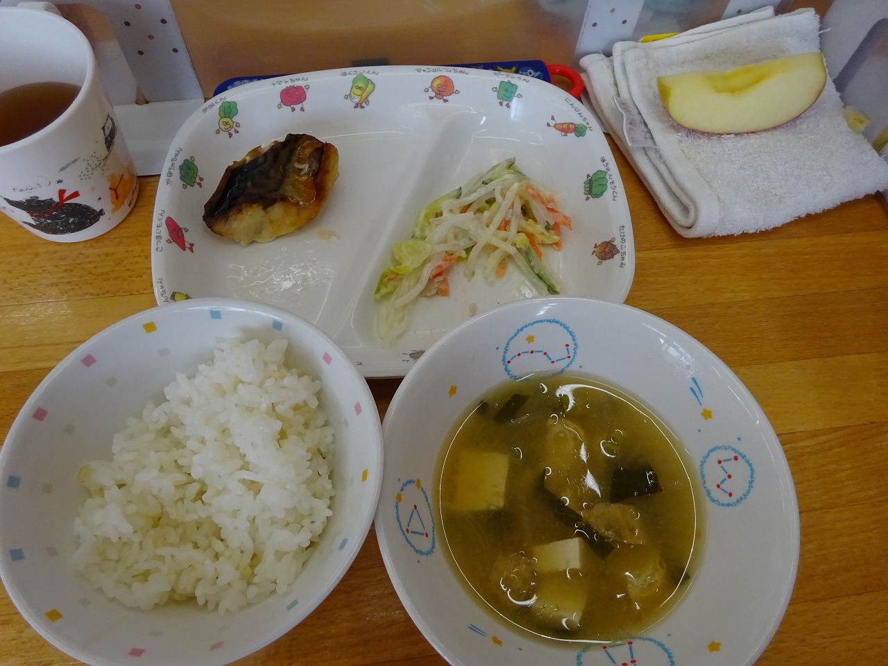 1月13日(金)給食 ・ごはん ・さばの塩焼き ・シルバーサラダ(マロニー・ハム・キャベツ・きゅうり・にんじん) ・みそ汁(豆腐・油揚げ・なめこ・こまつな・玉ねぎ・みそ) ・りんご