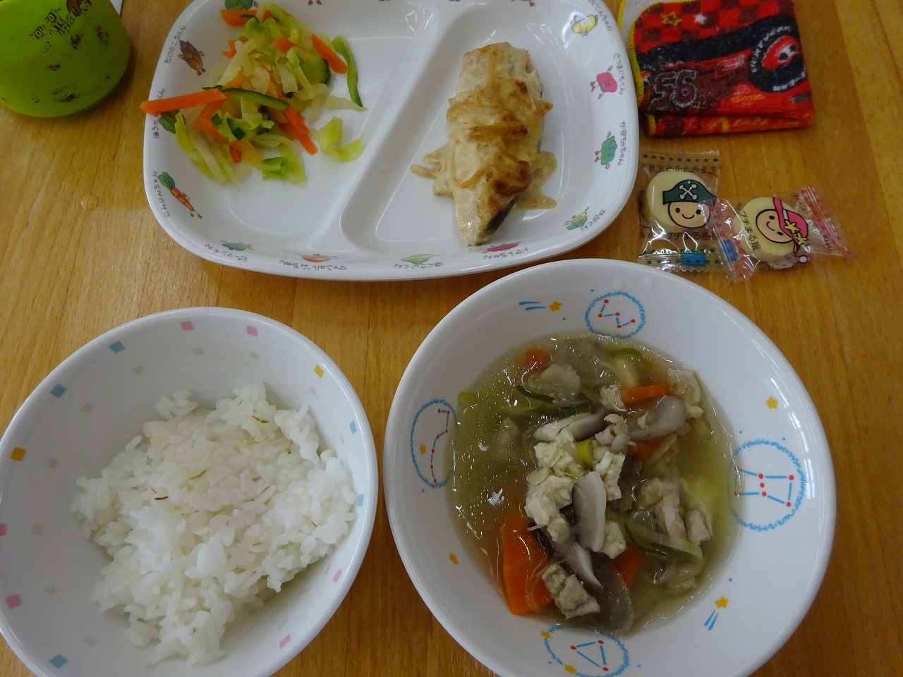 1月16日(月)給食 ・ごはん ・鮭のみそマヨ焼き(鮭・玉ねぎ・マヨドレ・みそ) ・和風サラダ(キャベツ・きゅうり・にんじん・だいこん) ・かみなり汁(鶏肉・豆腐・ごぼう・にんじん・しいたけ・ねぎ) ・チーズ