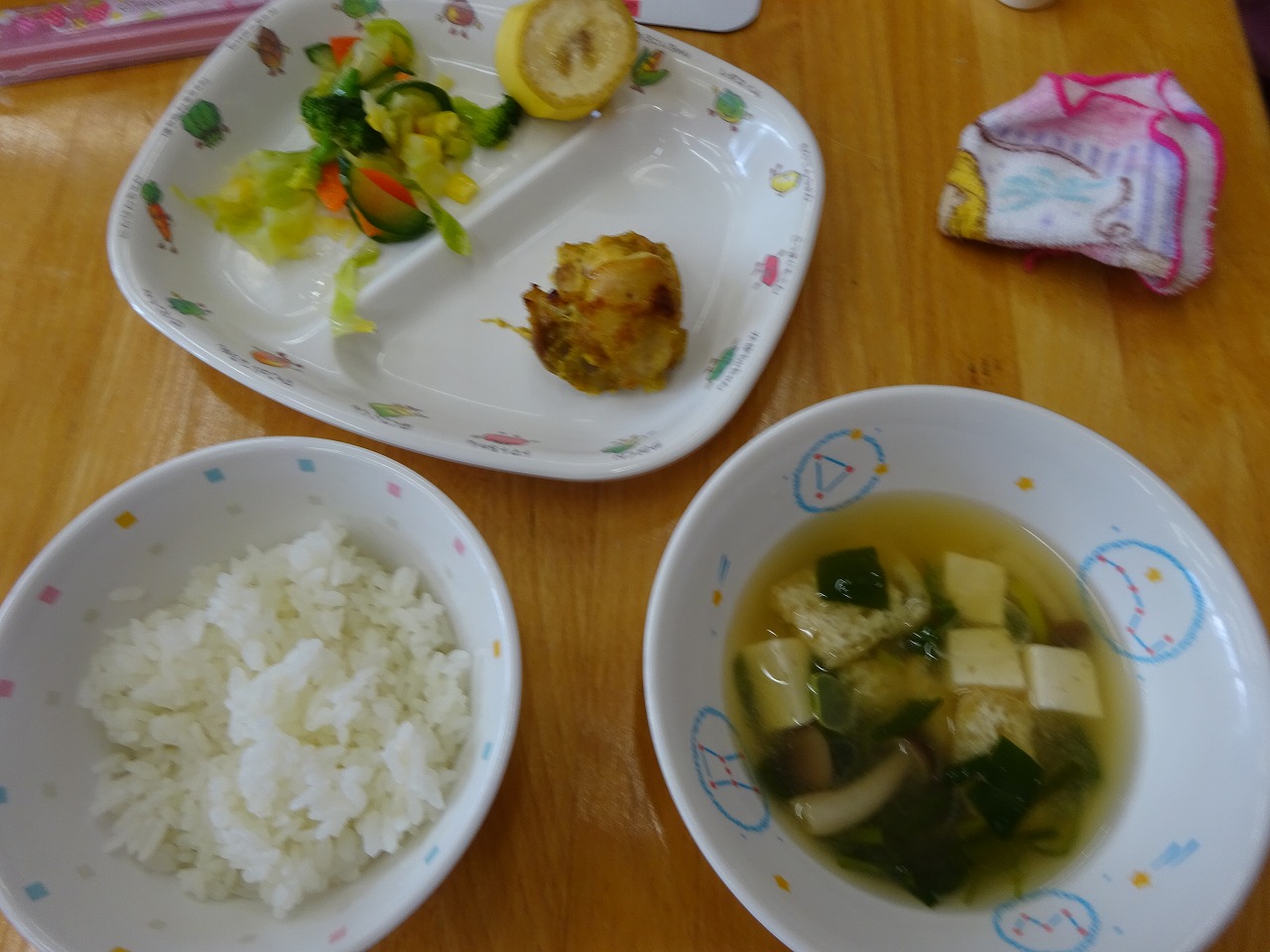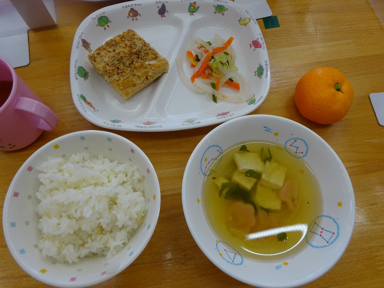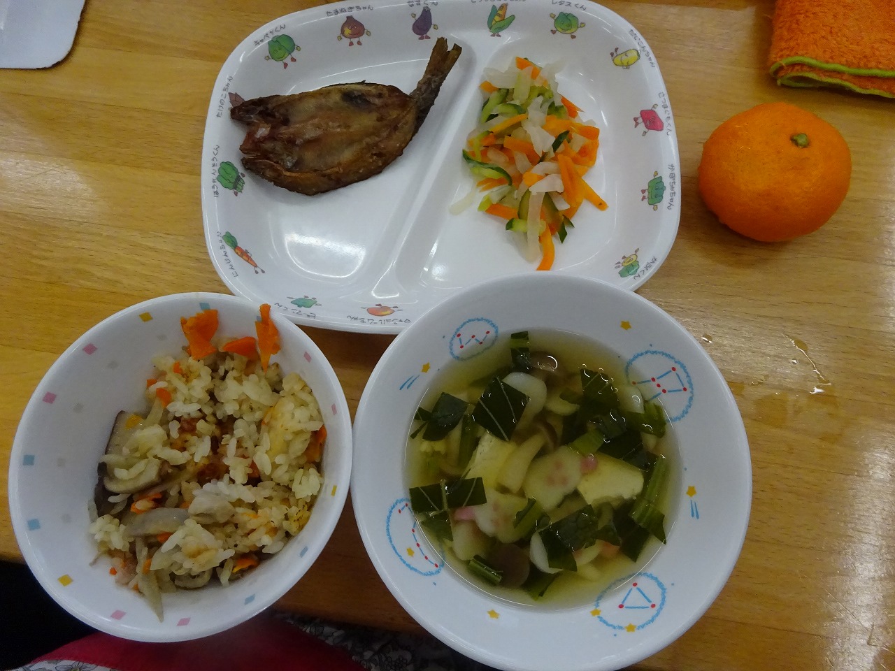 1月24日(火)給食 ・鶏五目ごはん(米・鶏肉・ごぼう・にんじん) ・にじますの唐揚げ ・大根の酢の物(だいこん・きゅうり・にんじん) ・すまし汁(豆腐・かまぼこ・こまつな・しめじ) ・みかん