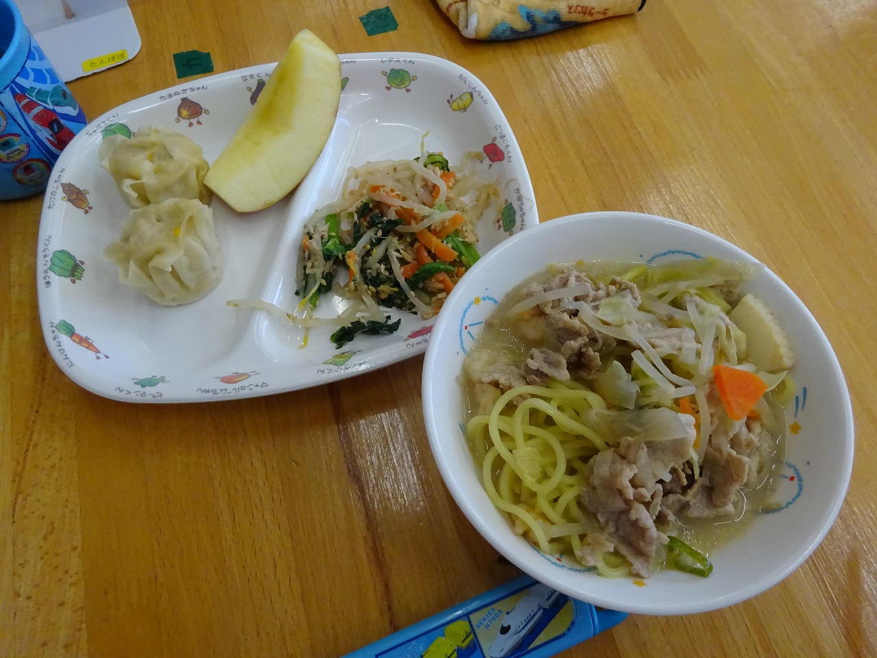 1月19日(木)給食 ・チャンポン麵(麺・豚肉・えび・いか・玉ねぎ・キャベツ・にんじん・ねぎ) ・小松菜のごまあえ(小松菜・にんじん・もやし・ツナ・ごま) ・コーンシューマイ ・りんご
