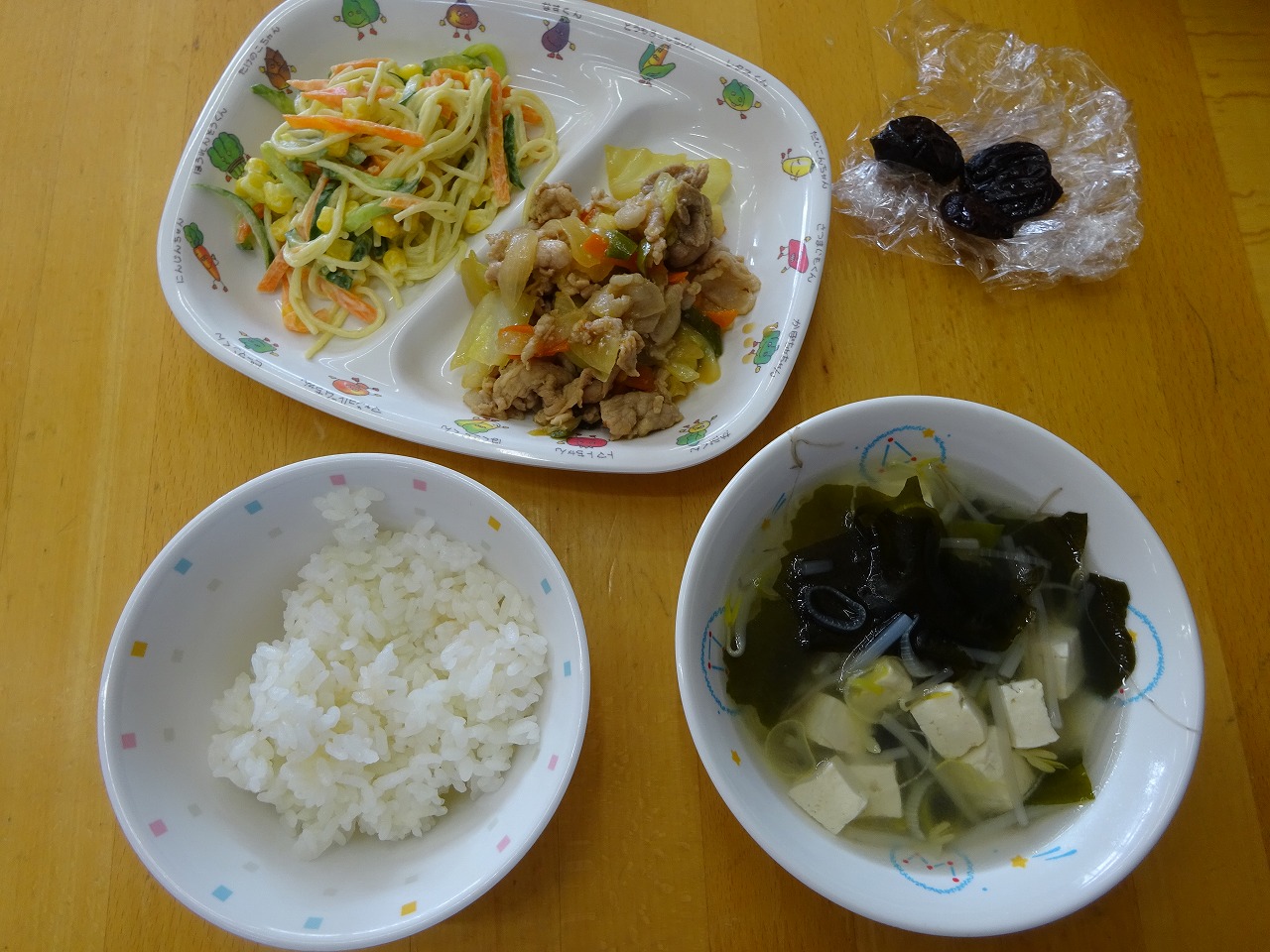 1月23日(月)給食 と おやつ ・ごはん ・ホイコーロー(豚肉・キャベツ・玉ねぎ・にんじん・ピーマン・みそ) ・サラスパサラダ(サラスパ・きゅうり・にんじん・ハム・コーン・マヨドレ) ・わかめスープ(わかめ・豆腐・もやし・ねぎ) ・プルーン 今日のおやつは、 『お麩ラスク』