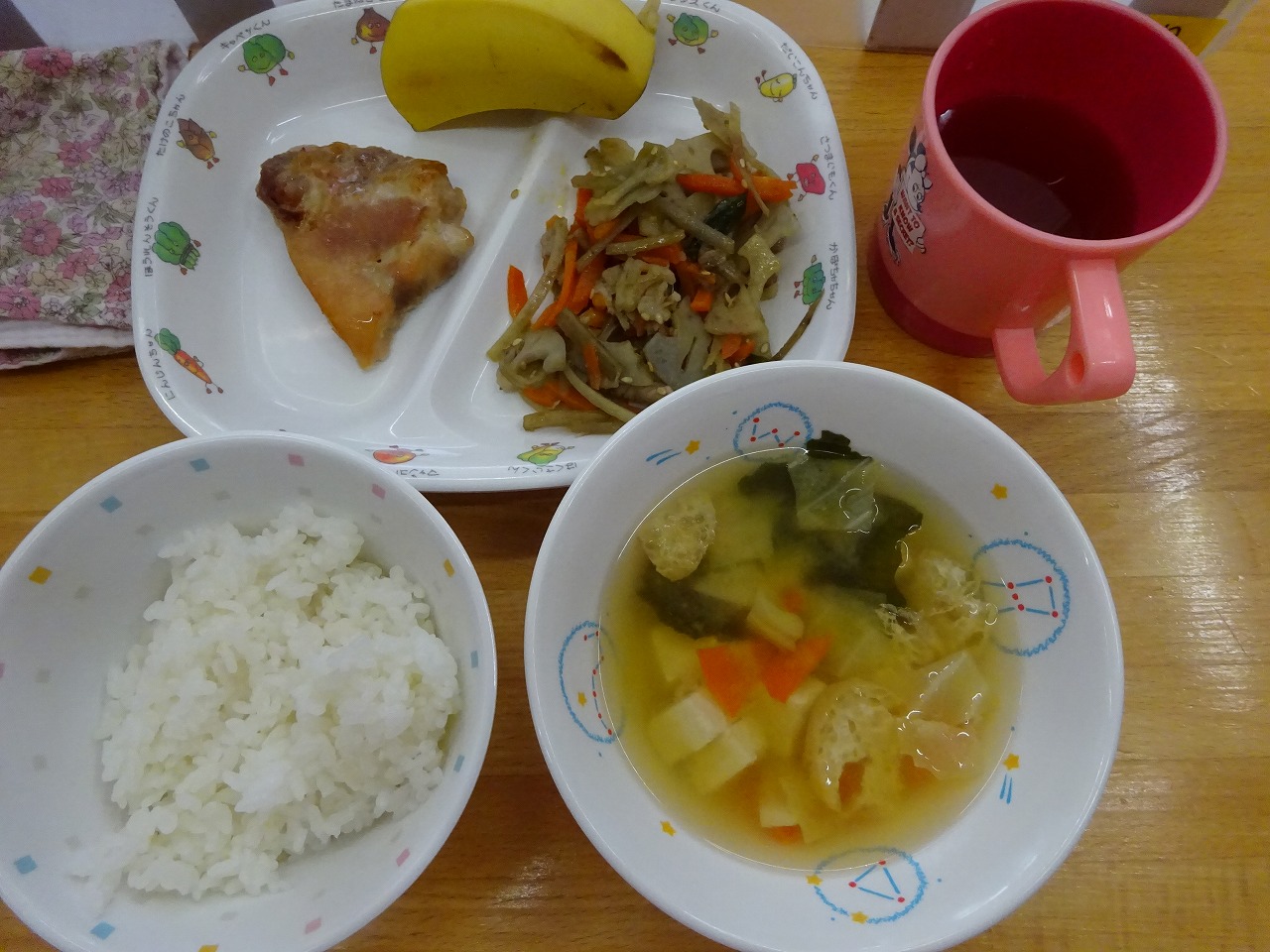 1月26日(木)給食 ・ごはん ・鶏肉の香味焼き ・五目きんぴら(ごぼう・豚肉・にんじん・れんこん・いんげん) ・みそ汁(豆腐・油揚げ・キャベツ・にんじん・わかめ・みそ) ・バナナ