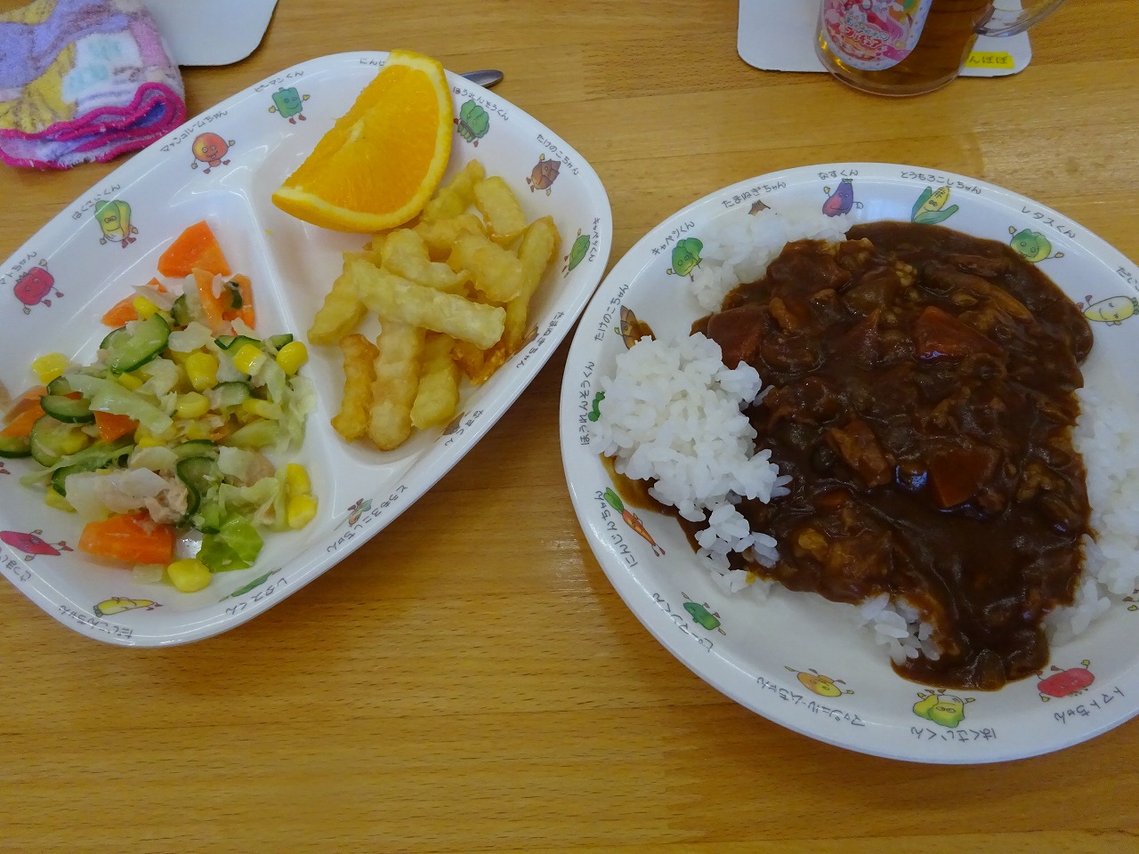 11月14日(月)給食 ・ハヤシライス(米・豚肉・玉ねぎ・にんじん・しめじ) ・コーンサラダ(コーン・キャベツ・きゅうり・ブロッコリー・にんじん) ・フライドポテト ・オレンジ