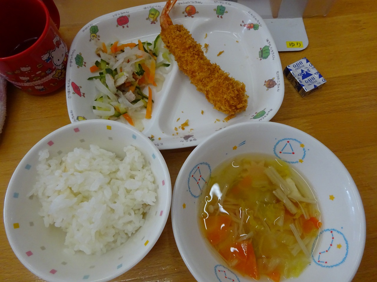 11月15日(火)給食 ・ごはん ・えびフライ ・三色なます(だいこん・にんじん・きゅうり・ハム) ・すまし汁(豆腐・かまぼこ・はくさい・にんじん・えのきたけ) ・チーズ