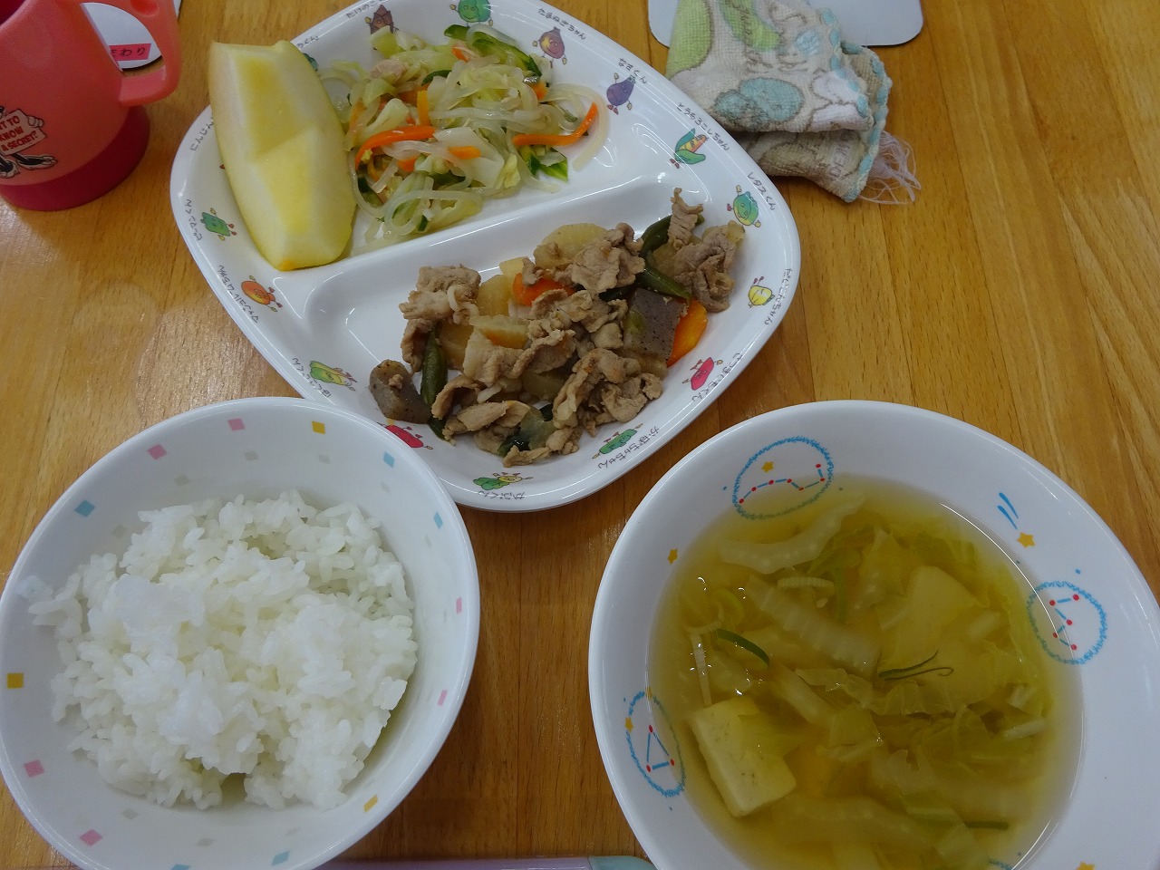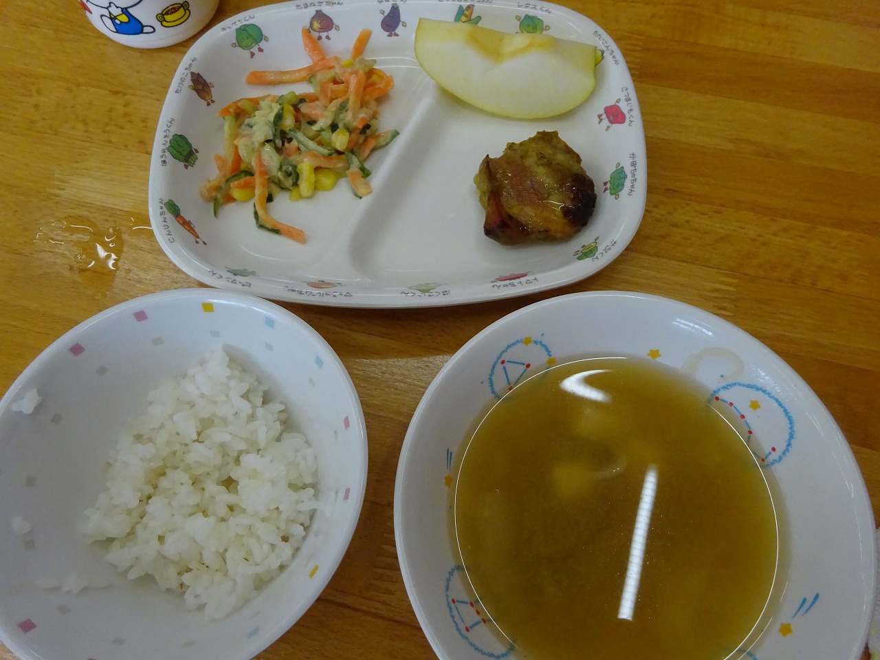 11月17日(木)給食 ・ごはん ・鶏肉の照り焼き ・にんじんサラダ(にんじん・きゅうり・コーン・ツナ・マヨドレ) ・みそ汁(豆腐・油揚げ・白菜・しいたけ・ねぎ) ・りんご