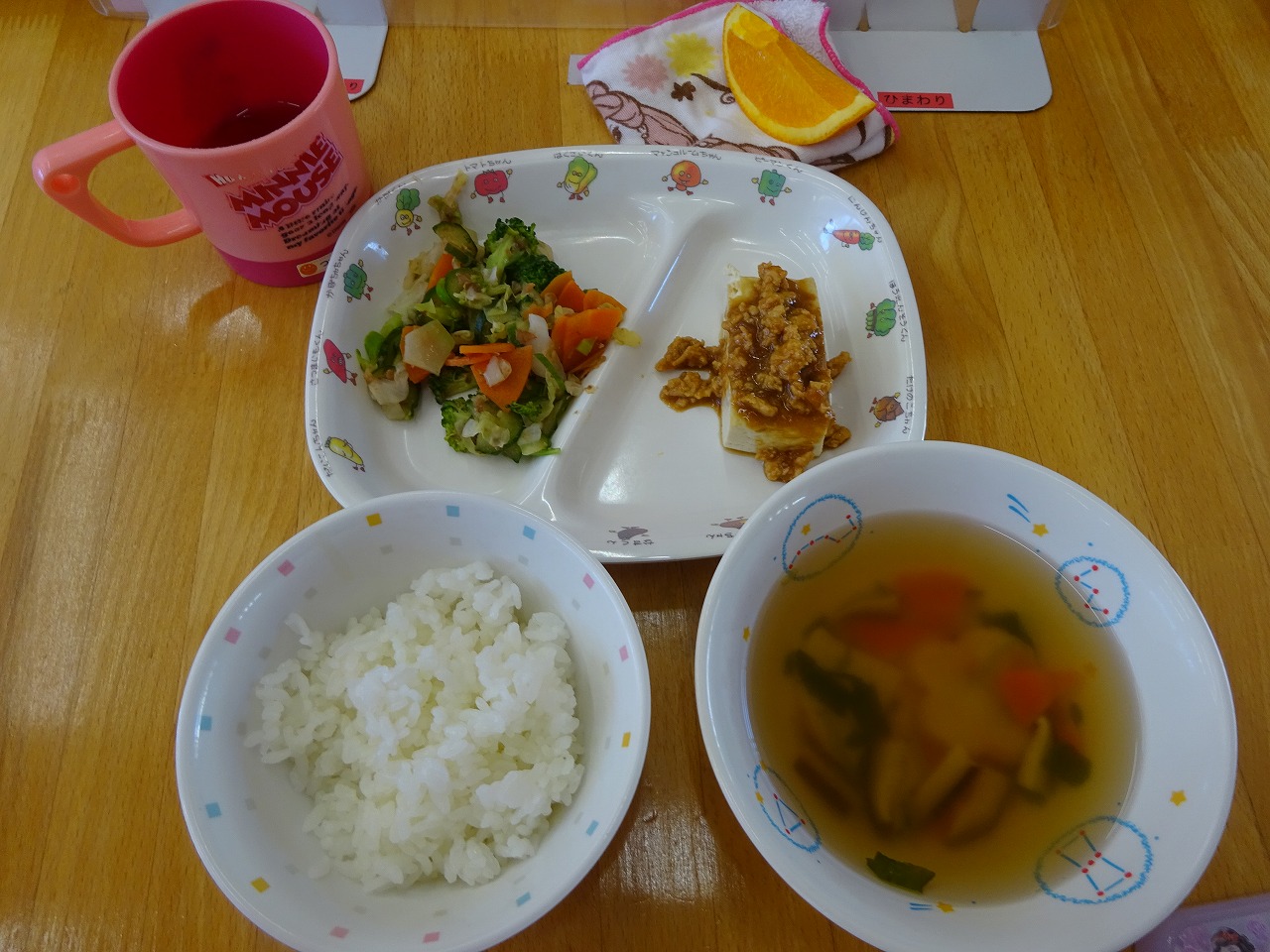 11月21日(月)給食 ・ごはん ・焼き豆腐の肉みそかけ(焼き豆腐・鶏挽肉・玉ねぎ・みそ) ・梅かつおあえ(ブロッコリー・キャベツ・きゅうり・にんじん・梅びしお) ・すまし汁(かまぼこ・花ふ・にんじん・しいたけ・みつば) ・オレンジ