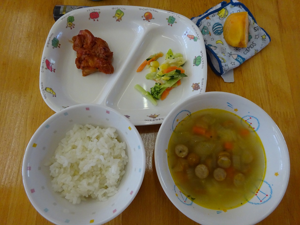 11月25日(金)給食 ・ごはん ・鶏肉のアリゾナステーキ ・コールスローサラダ(キャベツ・ブロッコリー・きゅうり・にんじん・コーン・マヨドレ) ・野菜スープ(ウインナー・玉ねぎ・じゃがいも・にんじん・パセリ) ・かき