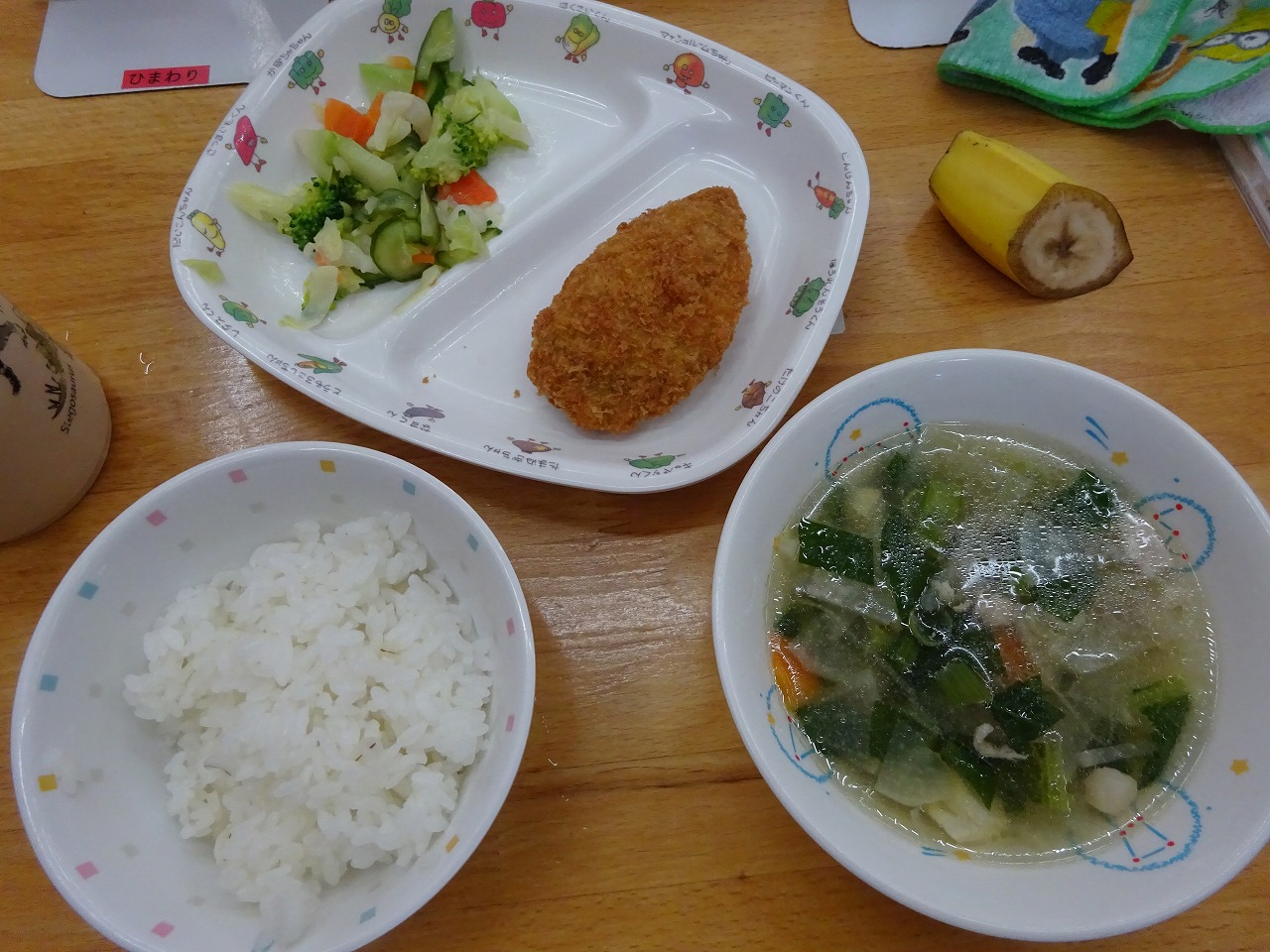 12月2日(金) 給食 ・ごはん ・かつおフライ ・ブロッコリーサラダ(ブロッコリー・キャベツ・きゅうり・にんじん) ・五目汁(鶏肉・だいこん・にんじん・こまつな・ねぎ) ・バナナ