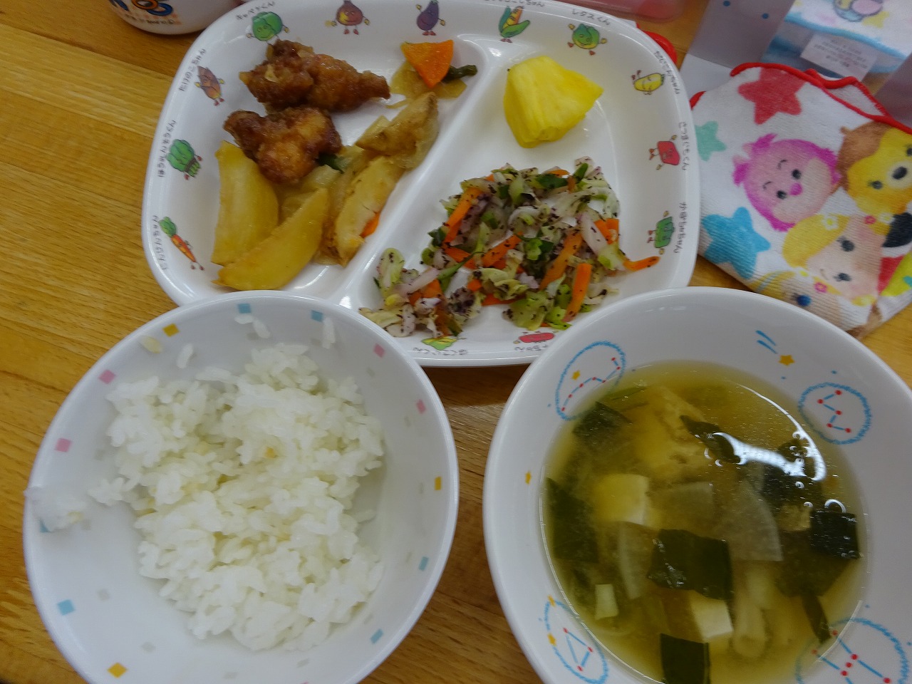 12月6日(火)給食 ・ごはん ・鶏肉とポテトの揚げ煮(鶏肉・ポテト・玉ねぎ・にんじん・いんげん) ・ゆありあえ(キャベツ・きゅうり・にんじん・ゆかり) ・みそ汁(豆腐・油揚げ・しめじ・こまつな・ねぎ・みそ) ・パイナップル